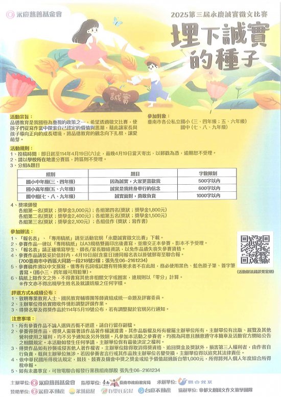 一、「報名表」、「專用稿紙」請至官網「永慶誠實徵文比賽」下載。