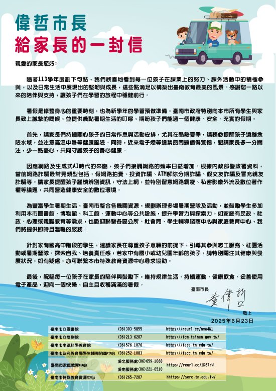 檢送「偉哲市長致家長的一封信」1份,如附件說明。