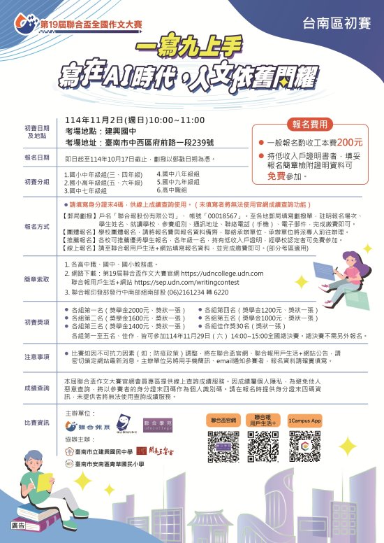 三、檢送活動海報、簡章如附件,本案活動請洽聯合報南部發行組(06)216-1234 。