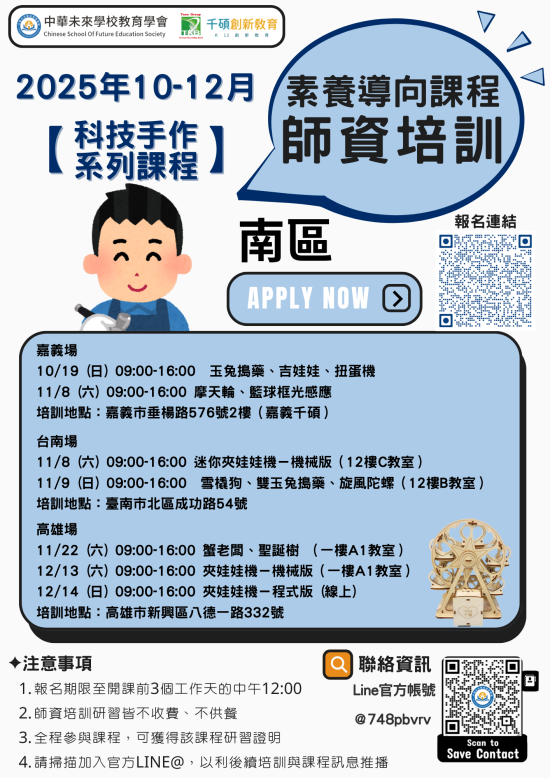 二、本系列研習規劃培訓三領域,包含 AI 系列領域:「AI 溝通師」、「AI 繪本大師」、「AI 虛擬主播」,職涯試探領域:中醫、理財,科技素養領域:科技手作,以協助教師精進多元素養教學能力,並拓展教學應用成效,詳見海報資訊。