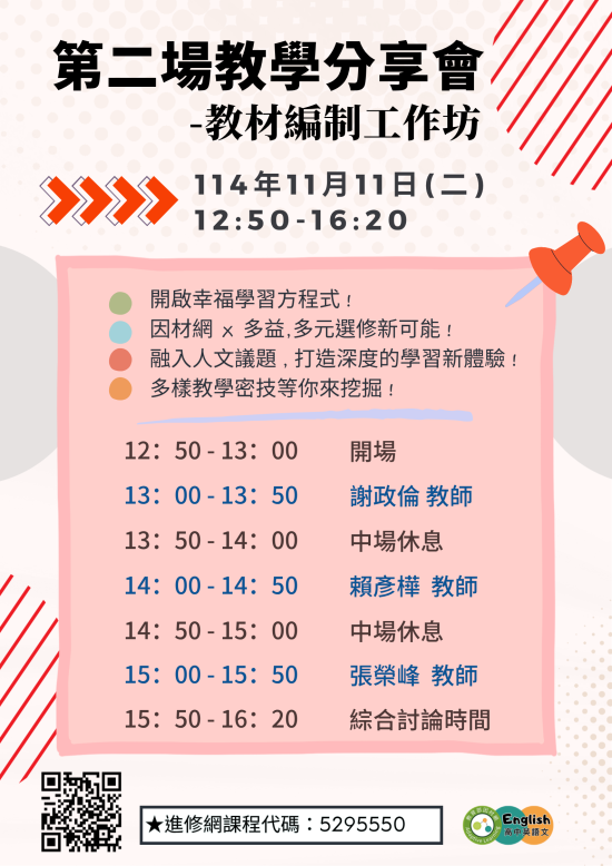 (二)研習時間: 114 年 11 月 11 日(星期二)中午 12 時 50 分至下午 4 時 20 分。