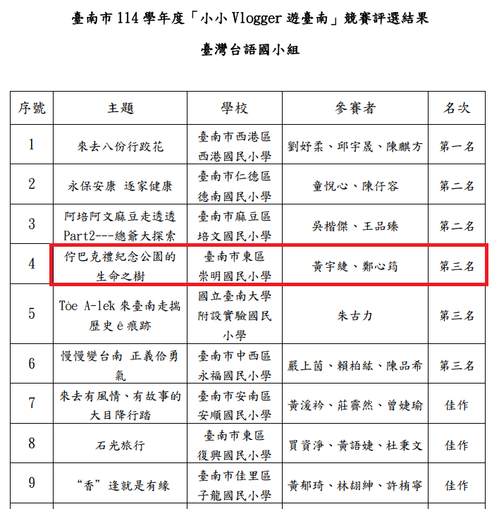 本校學生參加臺南市 114 學年度「小小 Vlogger 遊臺南」競賽得獎名單