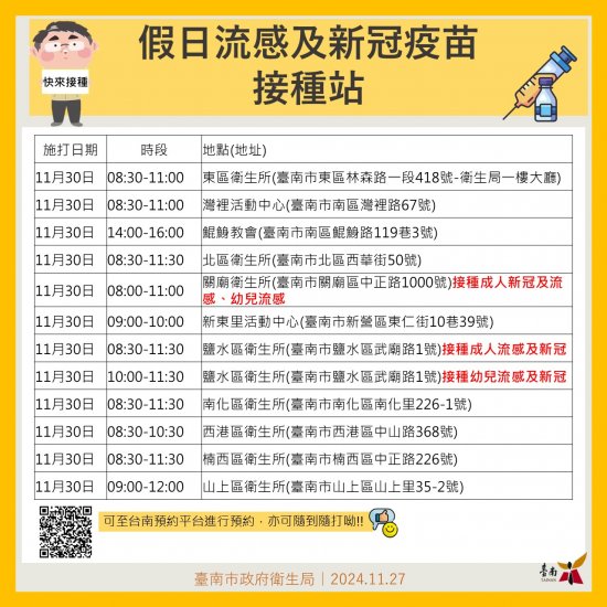 為守護自身與他人安全,疫苗接種有助於形成群體免疫,降低病毒傳播,特別是幼兒及學生等群聚易感族群。南市於本週獲中央增配賽諾菲流感疫苗計 12,000 劑,為鼓勵民眾接種,特別於本週六日(11/30-12/1)增設「左流右新」社區疫苗接種站,現場並提供賽諾菲流感疫苗供民眾接種,請平日不便前往合約院所接種疫苗之入學前幼兒、學生(接種流感疫苗須持補接種單)、醫事人員等可就近前往施打。