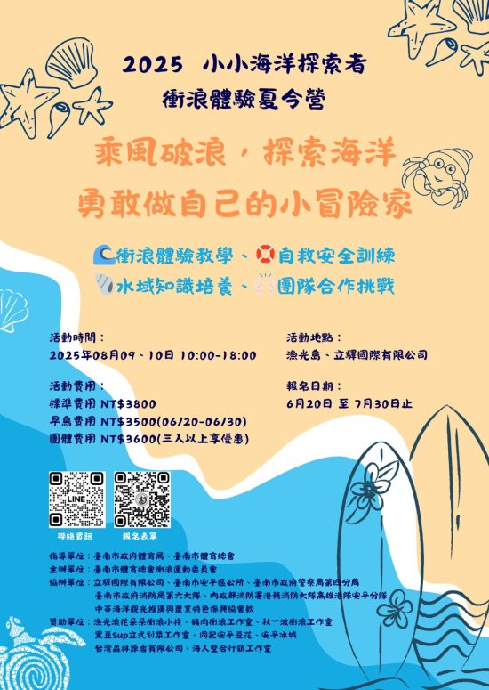 函轉社團法人臺南市體育總會衝浪委員會辦理「小小海洋探索者-夏令營」活動計畫書及宣傳海報各1份,請鼓勵師生踴躍報名參加