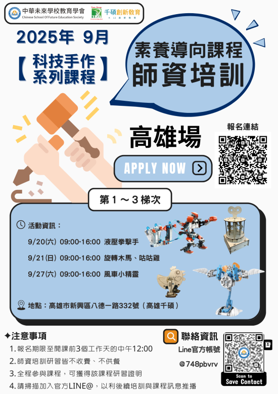 一、為增進教師跨領域專業知能,提升對 STEAM 教育之整合運用能力,並強化教學現場實務應用,本會特辦理「科技手作師資培訓課程」。