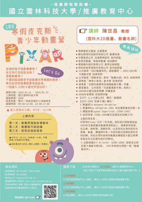 一、本校推廣教育中心將於 108 年 1 月 21 日至 108 年 1 月 23 日開辦「108 年寒假皮克斯青少年動畫營」課程,為學員提供動