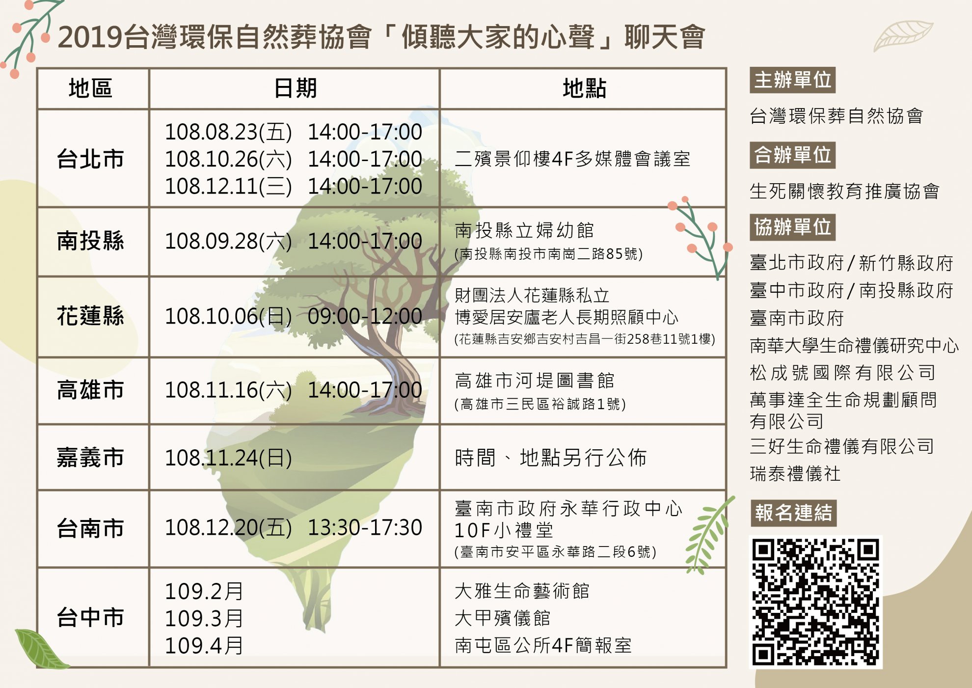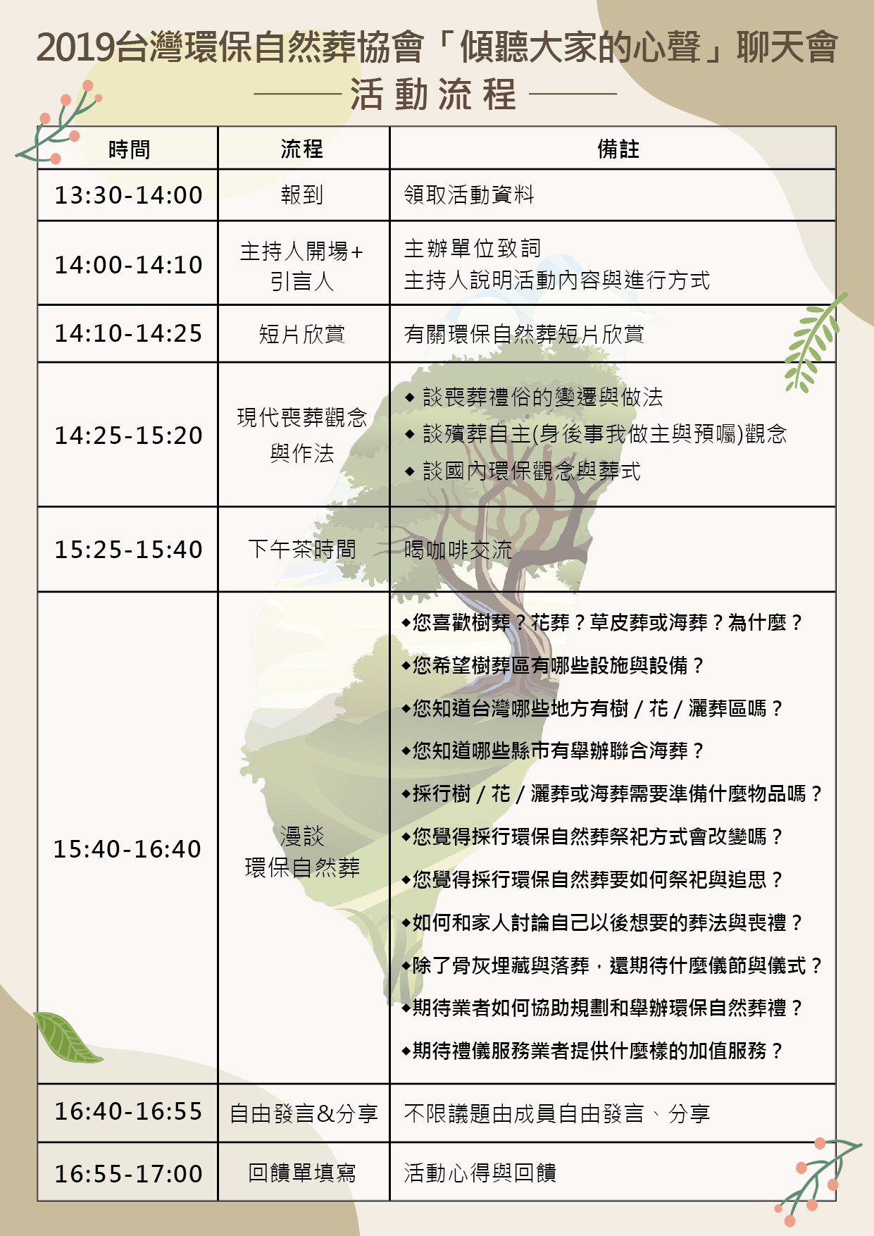 說明: 一、本活動將結合台灣死亡咖啡館活動方式辦理,以溫馨、輕鬆 、聊天方式進行,除討論環保自然葬觀念與做法外,也將宣導殯葬自主、身後事我做主(囑)和多元尊重之現代喪禮核心價值與理念。 二、隨附活動海報及流程表各乙份。 三、活動報名: https://forms.gle/hy6HTBwbfmdtaKUf7