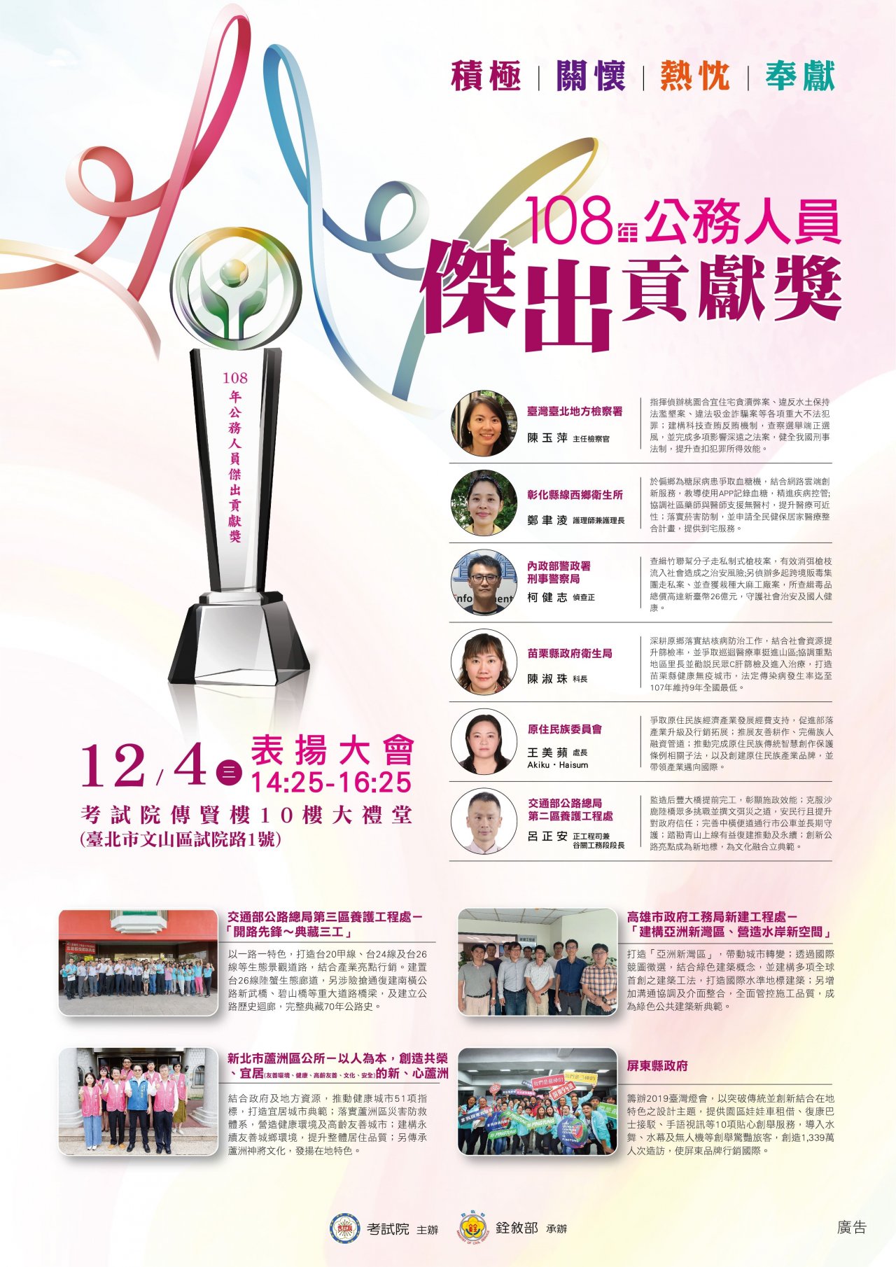 二、本( 108 )年公務人員傑出貢獻獎業經考試院組成評審委員會議,決議 6 名得獎人及 4 組得獎團體,茲檢附「108 年公務人員傑出貢獻獎表揚大會」電子海報及得獎者具體事蹟簡介各 1 份。(詳如附件)