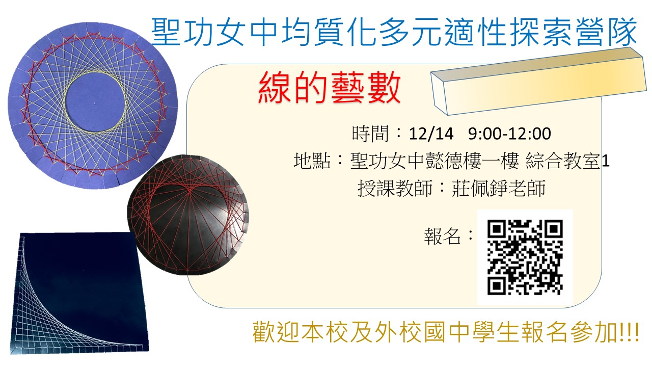 主旨:檢送本校 108 學年度高級中等學校適性學習社區教育資源均質化實施方案-多元適性探索營隊-線的藝數,敬請貴校轉知學生踴躍參與,營隊課程如說明,請查照。