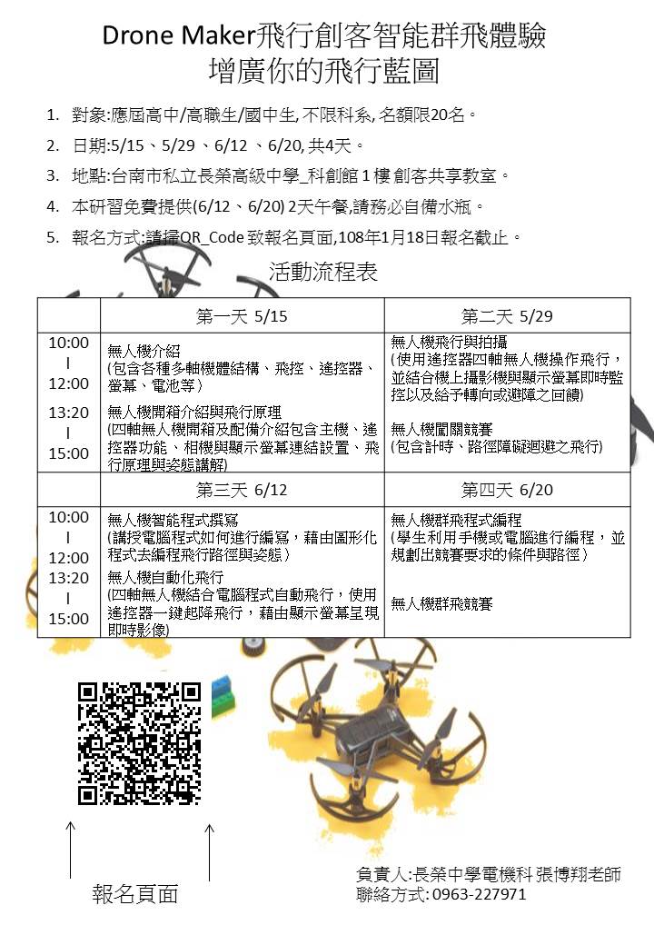 主旨:檢送本校 108 學年度高級中等學校適性學習社區教育資均質化實施方案工業群辦理「Drone Maker 飛行創客智能群飛體驗-增廣你的飛行藍圖」學生研習活動,敬請惠予公告並鼓勵學生踴躍參加,請查照。
