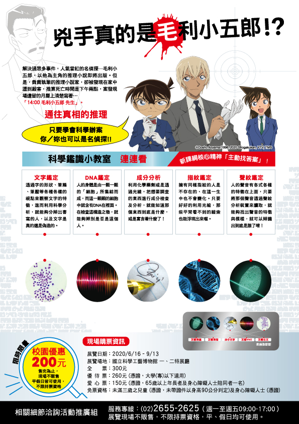 一、為培養獨立思考與充實科學領域的多元學習與認知,聯合數位文創引進以日本超人氣角色「名偵探柯南」為主題的科學搜查展,藉由原創案件情境引導大小朋友認識收集證據、科學鑑定等推理過程,親身走入故事場景,解開謎題,讓學習跳脫書本框架。展覽寓教於樂、內容豐富精采,適合各年齡層參觀,親子共遊!