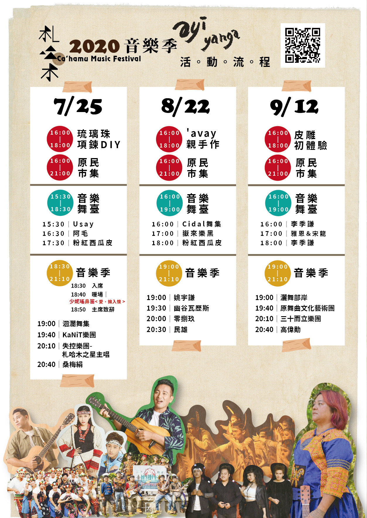 一、本府為促進原住民族音樂文化創意產業發展,於 109 年 7 月至 9 月辦理三場札哈木音樂季展演活動,除精彩的音樂表演,也有豐富美味的原住民料理、原鄉傳統美食與手作文創小品,帶給大家原汁原味的原民饗宴,現場也免費教授琉璃珠項鍊 DIY 、'avay 親手作及皮雕初體驗等不同系列活動。同時,為了回饋長久以來支持札哈木音樂季的粉絲,有獎徵答備有精美小禮品發送,歡迎周知並鼓勵踴躍參與。