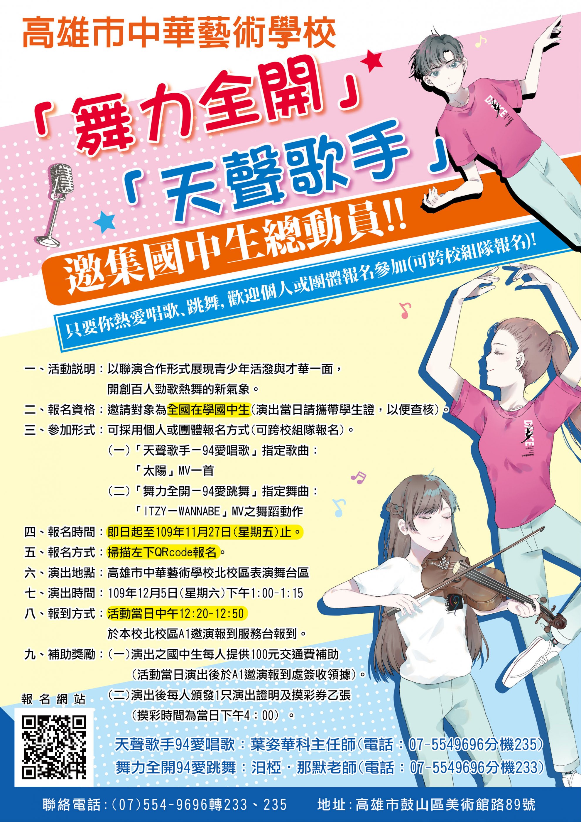 三、檢附「舞力全開 94 愛跳舞」、「天聲歌手 94 愛唱歌」邀演辦法及活動 DM 乙份、敬請惠予公告宣導,鼓勵學生踴躍報名。