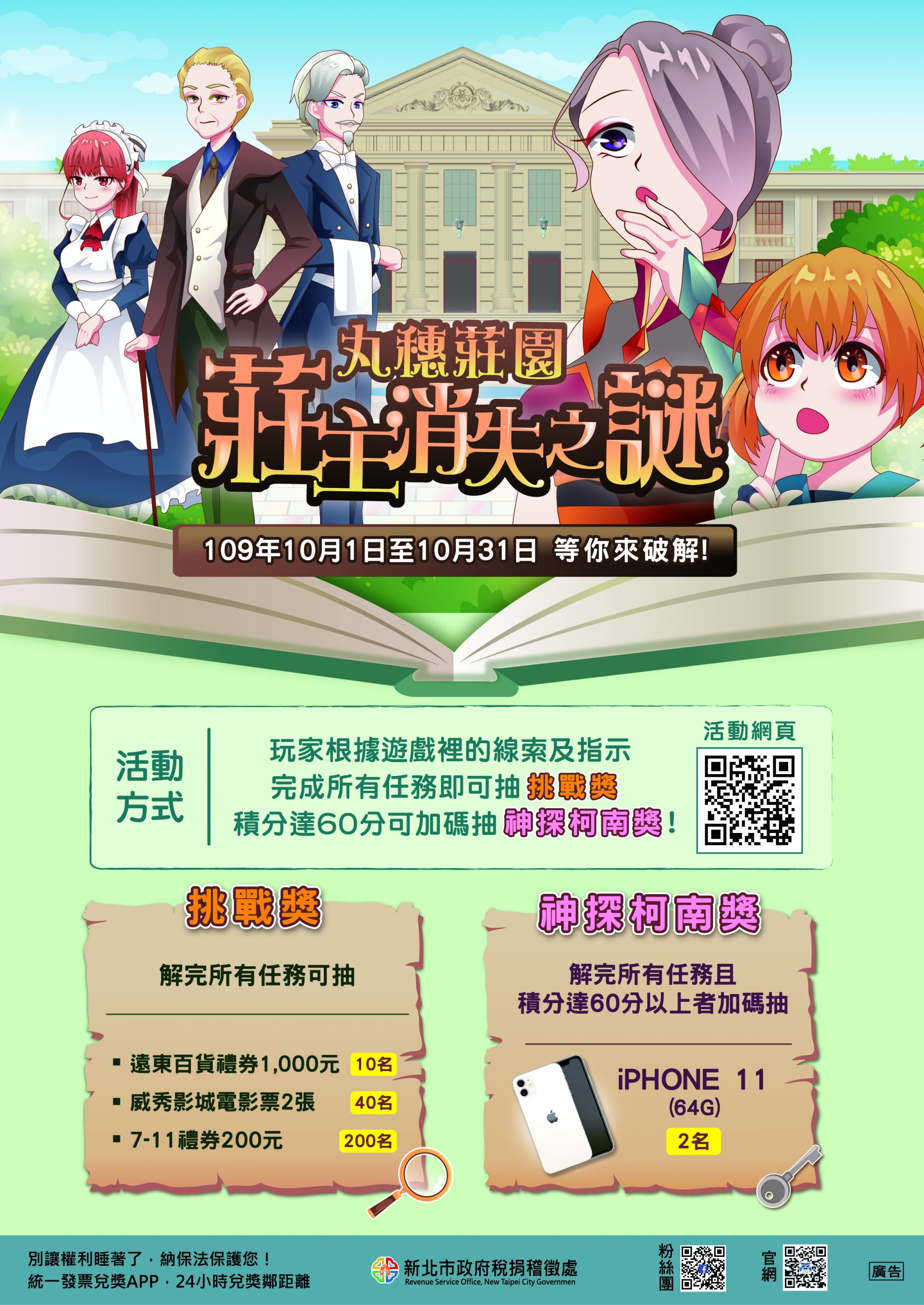主旨:台北稅捐稽徵處舉辦「丸穗莊園莊主消失之謎」網路互動式遊戲抽獎活動,活動期間自 109 年 10 月 1 日至 109 年 10 月 31 日止,請協助將活動訊息放置於所屬官網、 FB 及其他宣傳管道,並請鼓勵師生及家長踴躍參加,請查照。
