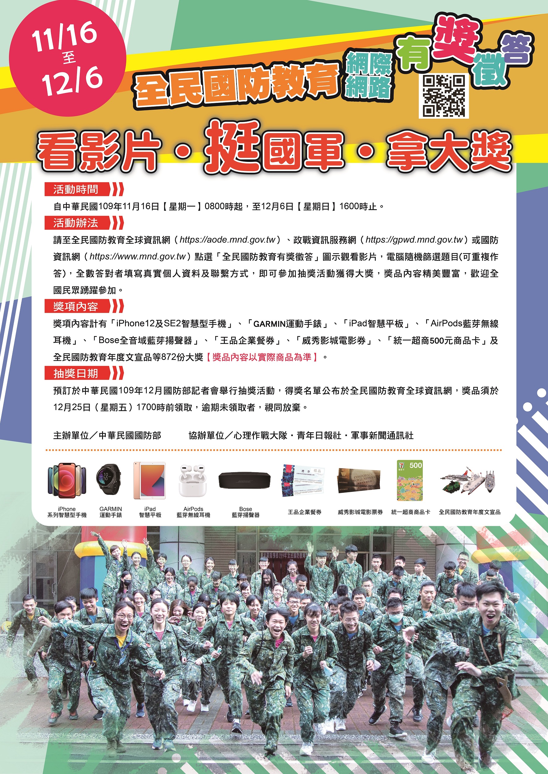 二、該部為推動全民國防教育,增進全民國防知識及全民防衛國土意識,藉辦理「網際網路有獎徵答活動」,擴大全民國防教育成效,達全面普及、深化教育目標。