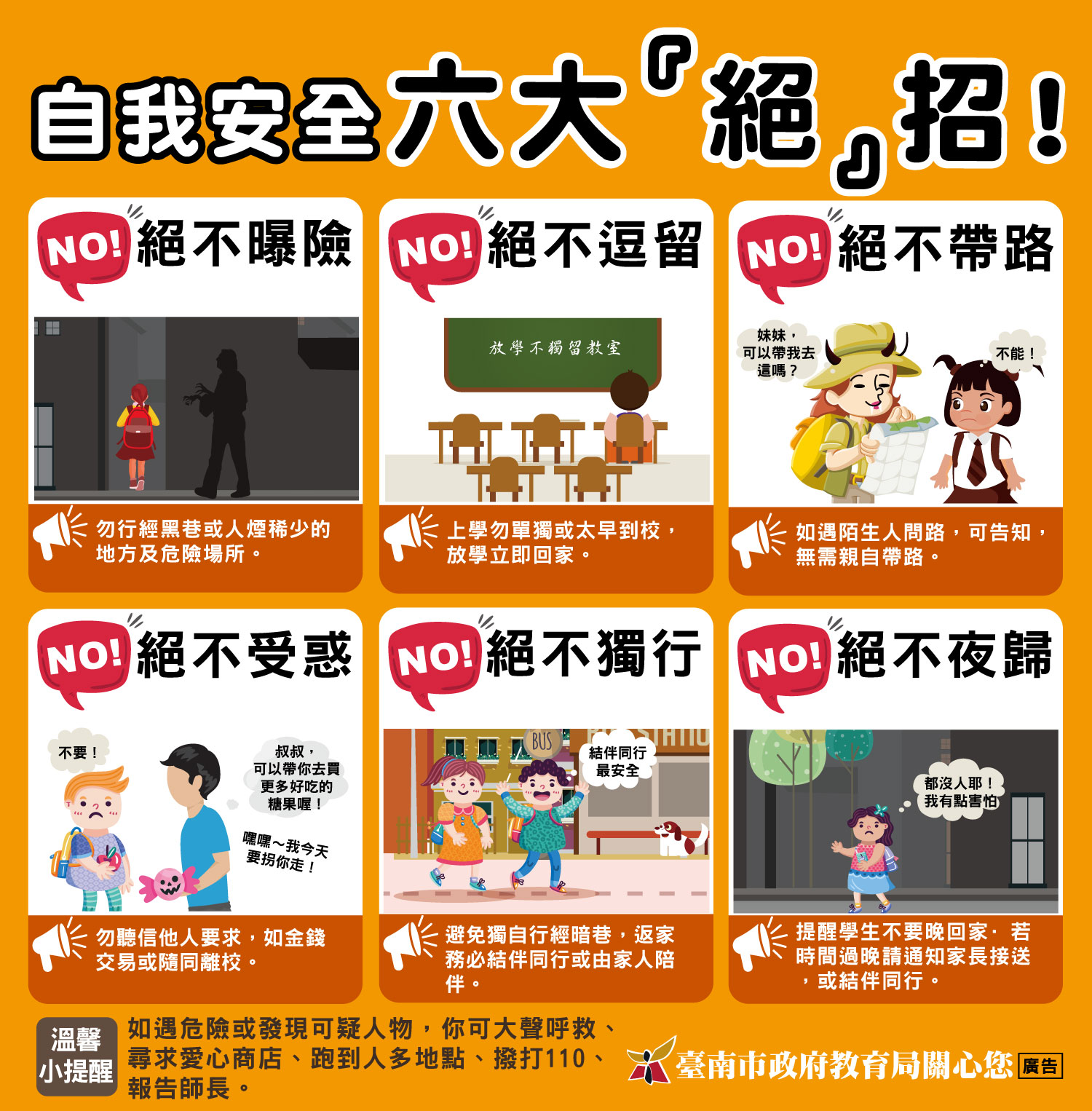 臺南市政府教育局製作「自我安全六大「絕」招」圖卡,宣導學生安全意識及被害預防觀念宣導。