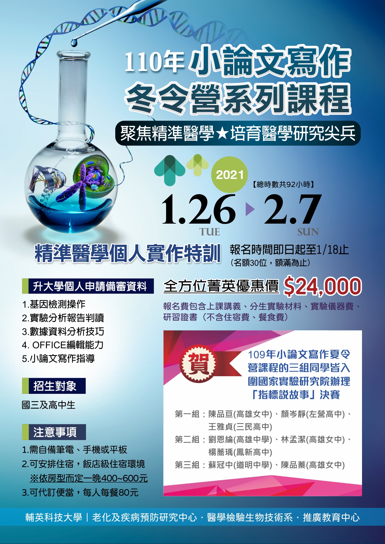 一、輔英科技大學 109 學年度第一學期推廣教育中心訂於 110 年 1 月 26 日至 110 年 2 月 7 日辦理「小論文寫作寒令營系列課程」,開課資訊詳如簡章說明,即日起開始報名。