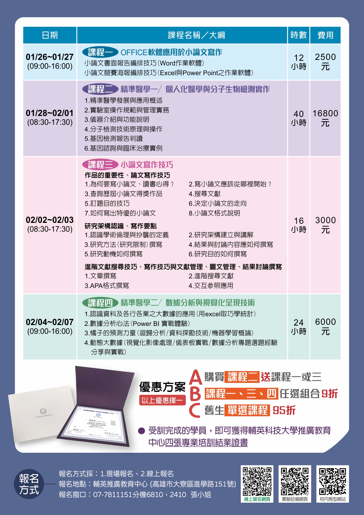 (一)現場報名-至本校推廣教育中心繳交報名表、 2 吋大頭照 4 張、身分證正反面影本及課程費用。