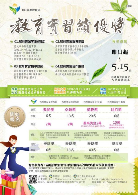六、本案聯絡人:張巧姿小姐; 04-7232105 轉 1154 ; E-mail :vivian@cc.ncue.edu.tw;計畫網站:http://eii.ncue.edu.tw/practice/。