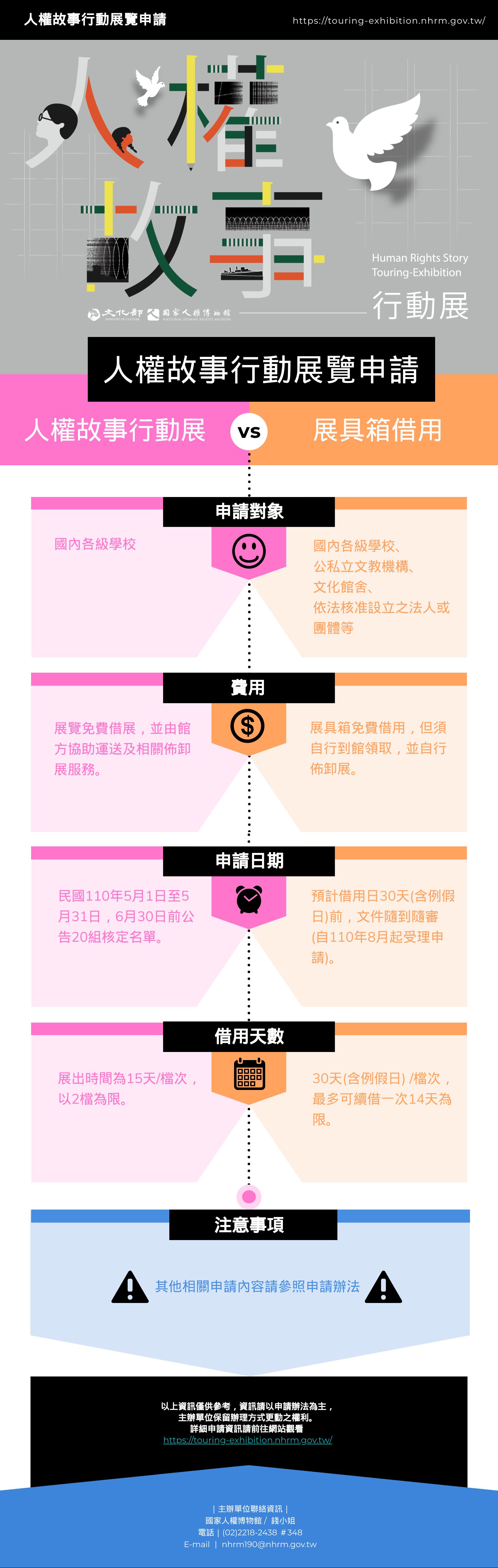 五、另,本館預計於 110 年 9 月推出人權故事行動展之「展具箱出借服務」(自 110 年 8 月 1 日起開始受理申請),申請對象包含國內各級學校(教師)、公私立文教機構、文化館舍、依法核准設立之法人或團體等。申請單位於預計借用日前 30 天(含例假日)填妥「展具箱借用申請表」予本館,隨到隨審。展具箱免費借用,惟申請單位須自行領取、歸還展具箱及自行佈卸展,並善盡保管之責。相關資訊亦請至上開主題網站查詢。