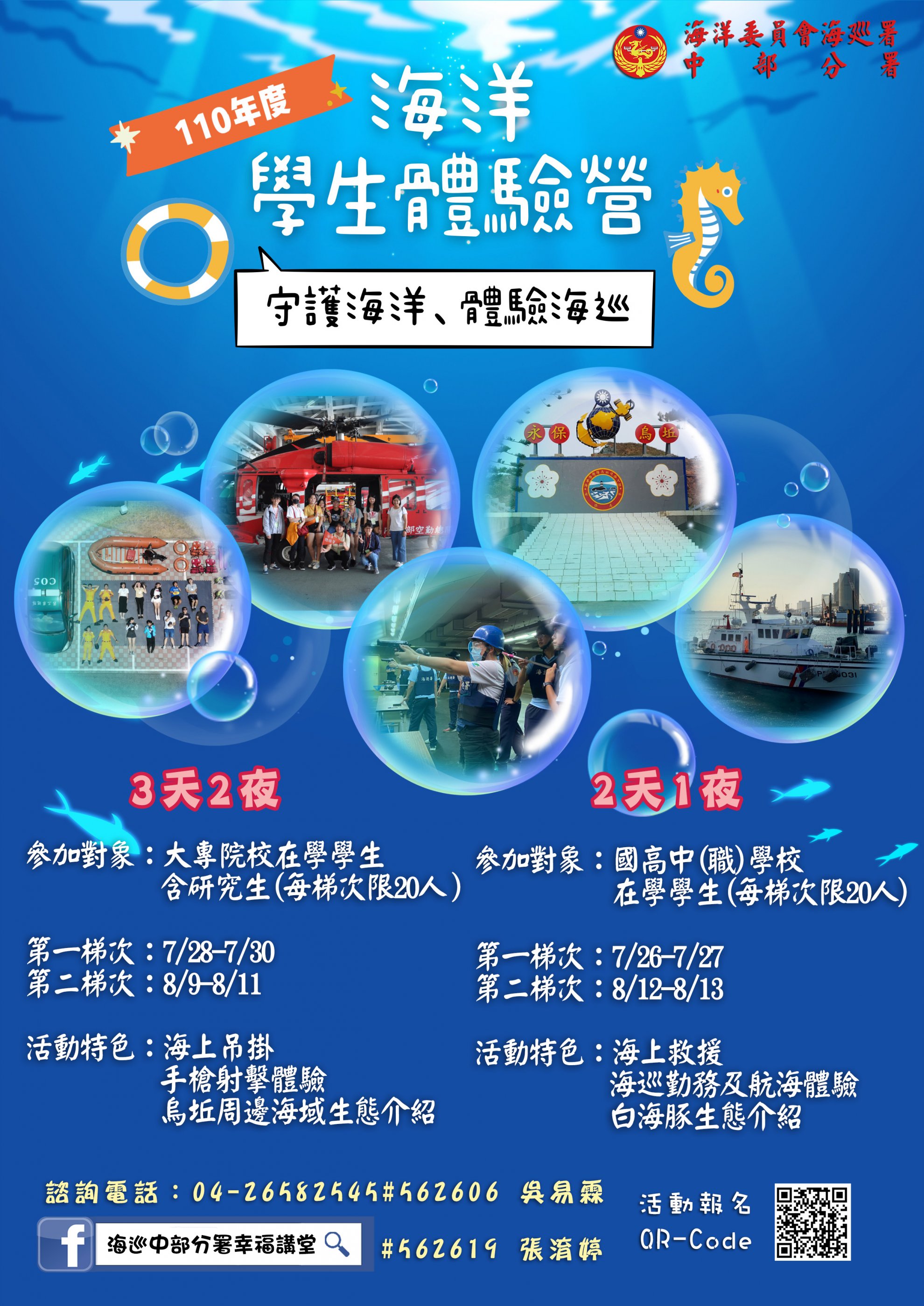 說明: 一、為培養青年學子對於海洋之情感與知識,提供暑期休閒育樂活動,爰訂 7 月至 8 月期間舉辦旨述活動,相關資訊詳如活動簡章。 二、本活動開放報名時間為 5 月 14 日 9 時起至 5 月 28 日 17 時止,採線上報名方式,報名平臺為本分署網頁海洋體驗營專區 ( http://www.cga.gov.tw/GipOpen/wSite/np?ctNode=11487&mp=9993 )。 三、請參閱電子文宣( EDM )及簡章。
