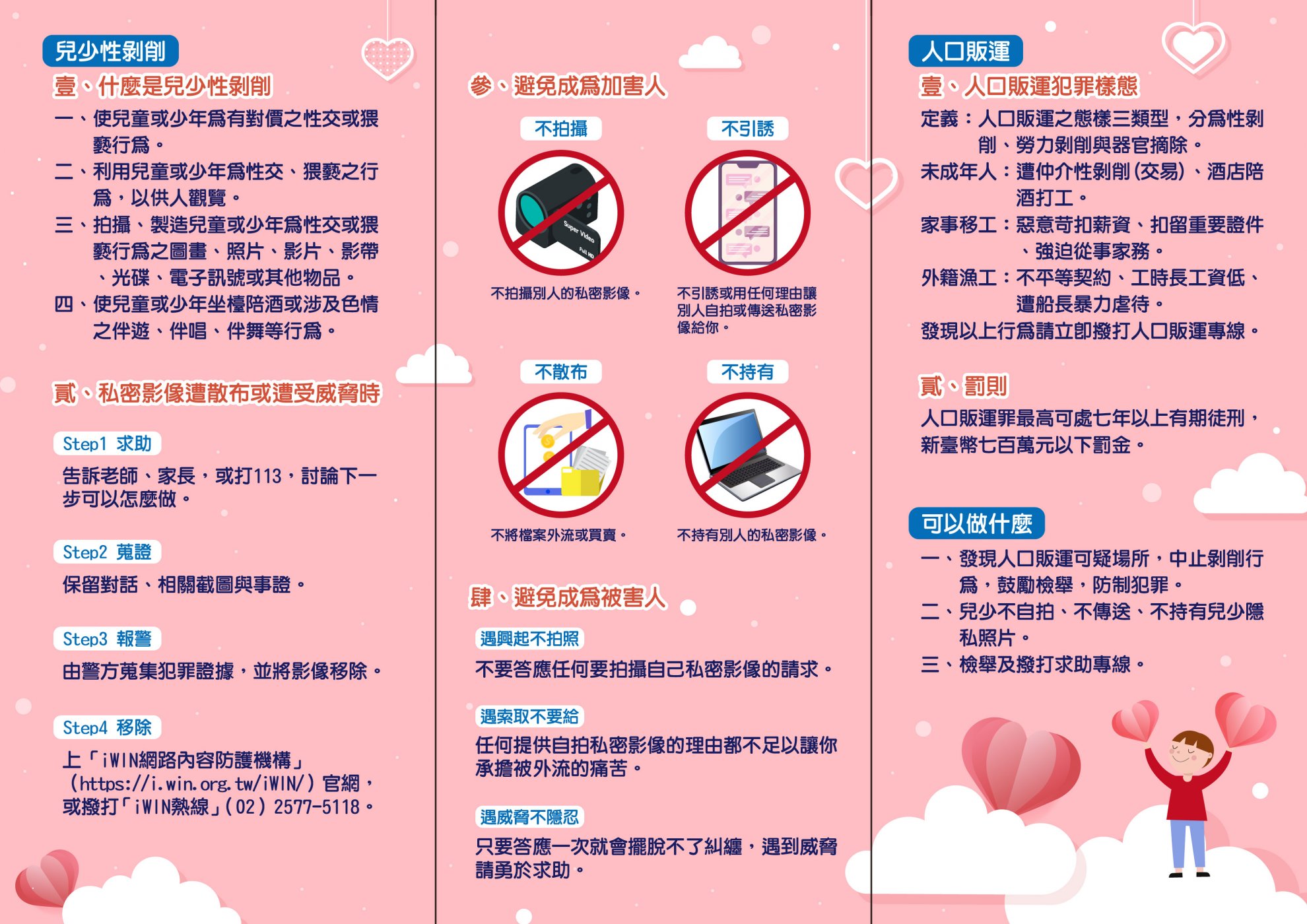 兒少性剝削防制,人人有責-兒少不自拍、不傳送、不持有兒少隱私照片;拒絕毒品危害,生活多彩多姿