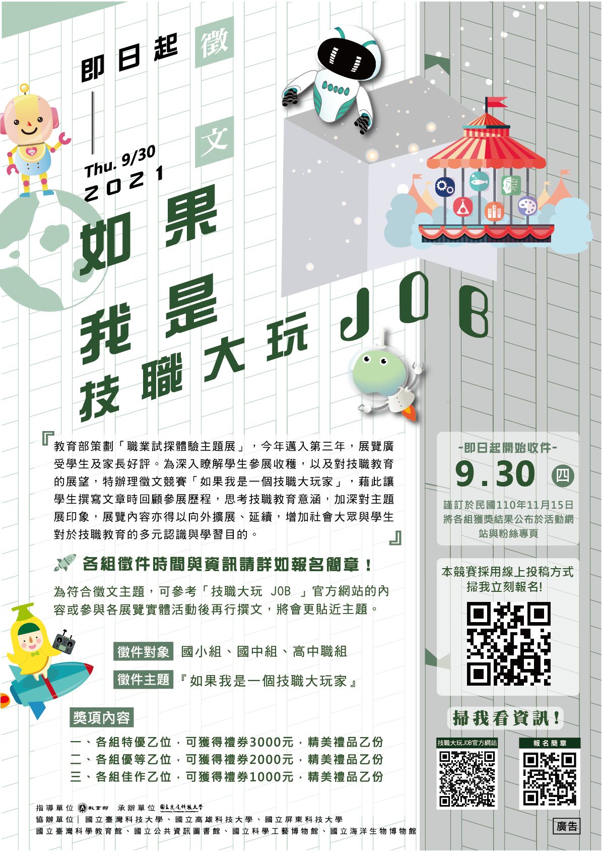 說明: 一、依據教育部110年9月6日臺教技(一)字第110120426號函辦理。 二、教育部與其所屬社教館所合作設置主題式職業試探體驗常設展,提供工業及農林漁牧等主題體驗活動,如:循線自走車、豐年蝦孵化、智能積木與編程機器人課程等體驗課程及職人主題講座等活動,供教師、家長及學生可深入了解技職教育,拓展未來職涯多元發展之可能性。 三、展場訊息刊登於旨揭網站(https://www.twmakers.com.tw),並提供線上課程、講座和體驗遊戲等內容,讓親師生能不間斷地探索與瞭解技職教育的內涵,請鼓勵並轉知師生踴躍運用。 四、為能深入瞭解學生參觀展覽或體驗課程後的收穫,舉辦「如果我是一個技職大玩家」徵文競賽,有意願參加者請於110年9月30日前投稿至Google表單者(https://reurl.cc/ZGErYW),將有機會獲得1000元至3000元不等的禮券及精美禮品1份。競賽報名詳情,請參閱「技職大玩JOB」網站或「技職動起來」臉書粉絲頁。 五、檢附徵文活動海報,如附件。 |