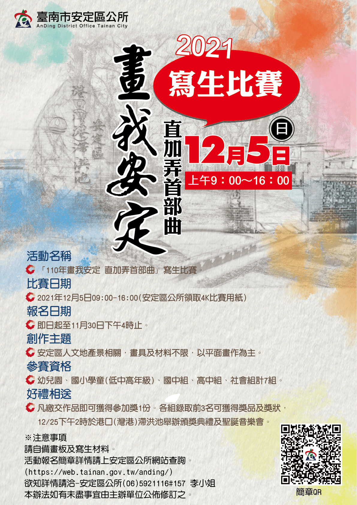一、為鼓勵繪畫愛好者探索安定不同視角之美,透過寫生比賽 詮釋不同視野的安定人文故事,希冀擴大行銷安定,落實 教育文化理念,讓生活美學觀念深入每個家庭及校園內。