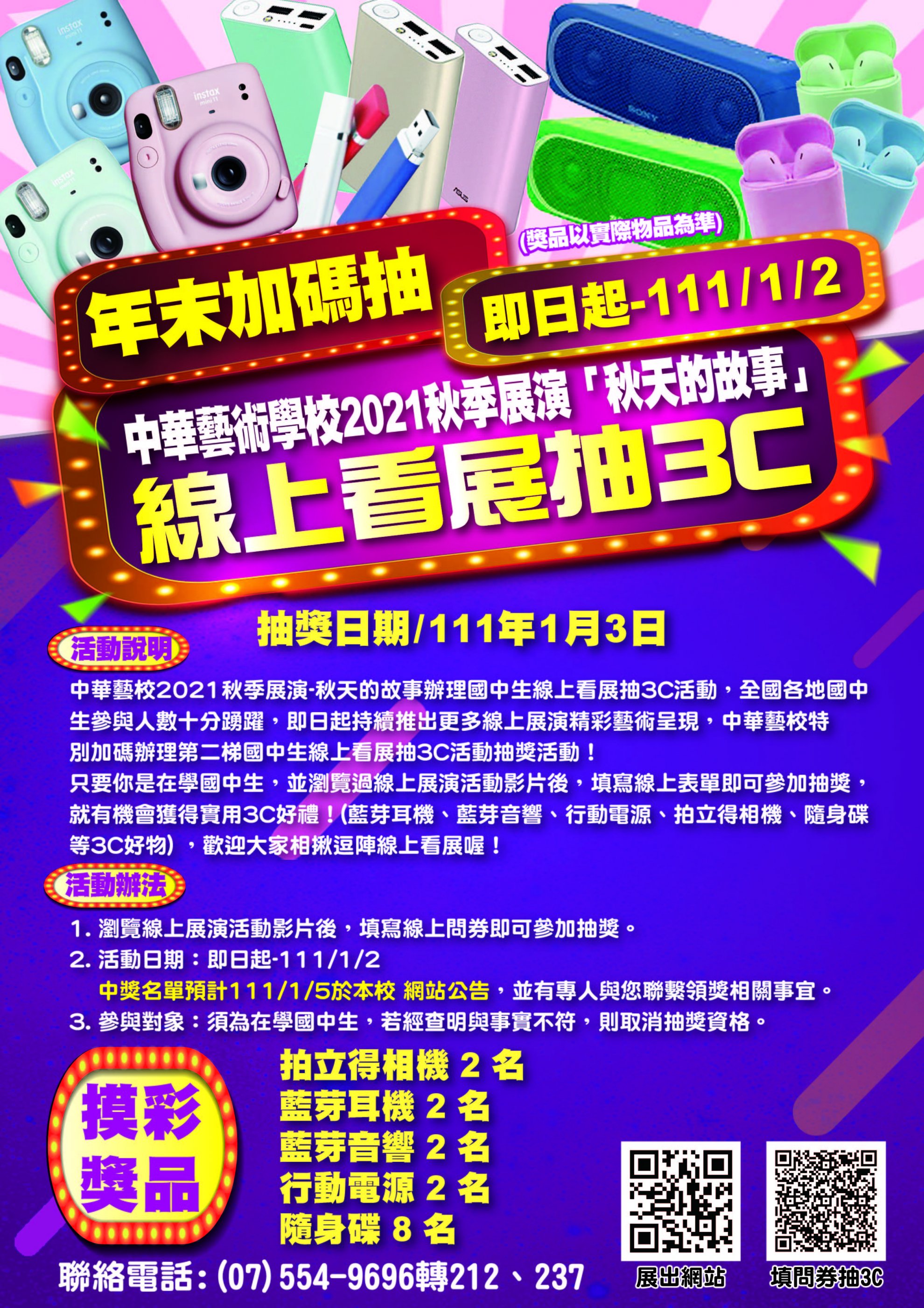 一、中華藝校 2021 秋季展演-秋天的故事辦理國中生線上看展抽 3C 活動,全國各地國中生參與人數踴躍,即日起持續推出 更多線上展演精彩藝術呈現,瀏覽線上展演活動影片後填 寫線上問卷即可參加抽獎活動。