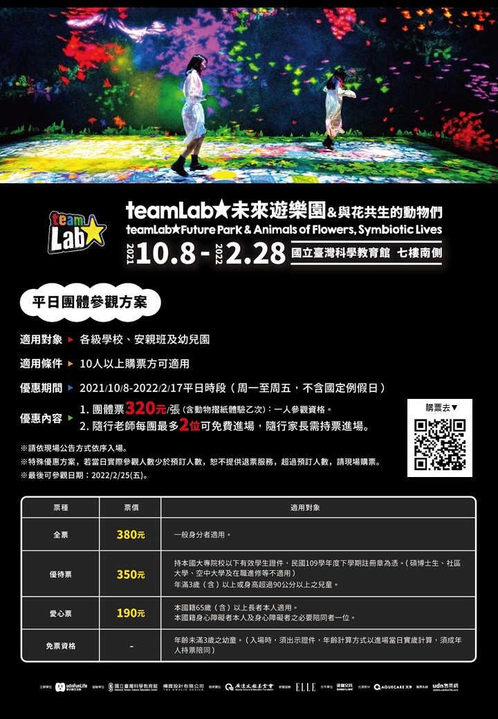 於 110 年 10 月 8 日~111 年 2 月 28 日於國立臺灣科學 教育館七樓南側特展區舉辦「teamLab 未來遊樂園&與花共 生的動物們」特展