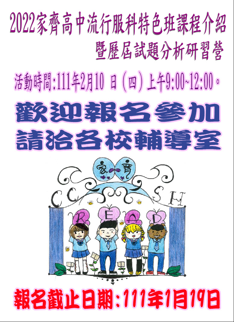 二、謹訂於 111 年 2 月 10 日(週四)舉辦「流行服飾科特色班課程介紹暨歷屆試題分析」研習營。