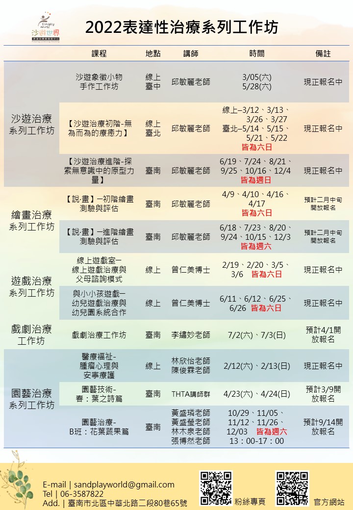 主旨:臺南市沙遊世界表達與療癒發展中心暨禾心心理諮商所主辦「沙遊治療系列工作坊」、「遊戲治療系列工作坊」、「繪畫治療系列工作坊」、「戲劇治療工作坊」、「園藝治療師培訓課程」,共十三門課程,敬請轉知所屬心理輔導相關人員、幼兒保育相關人員、相關科系研究生及欲學習園藝治療者,並惠予公假出席,請查照。