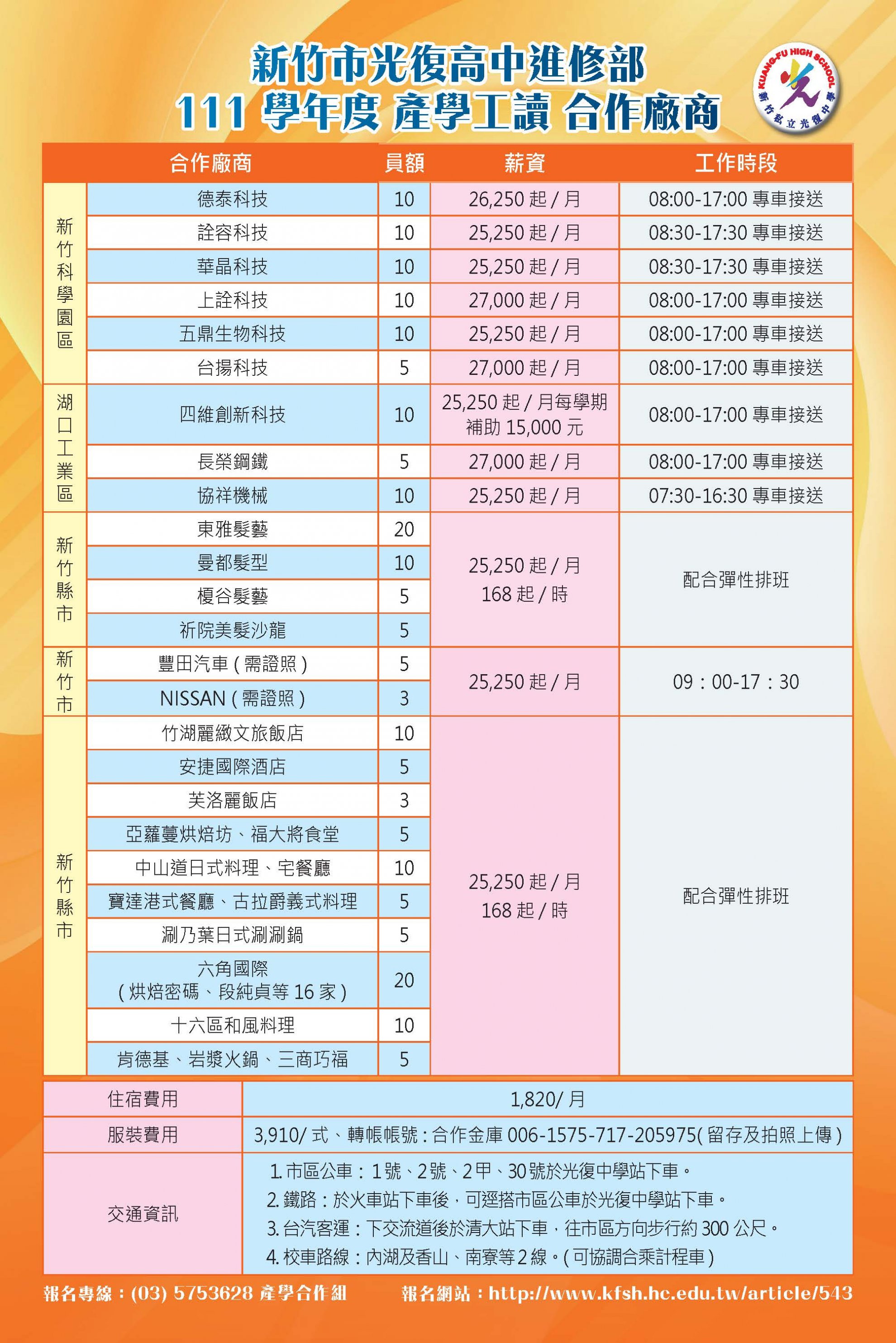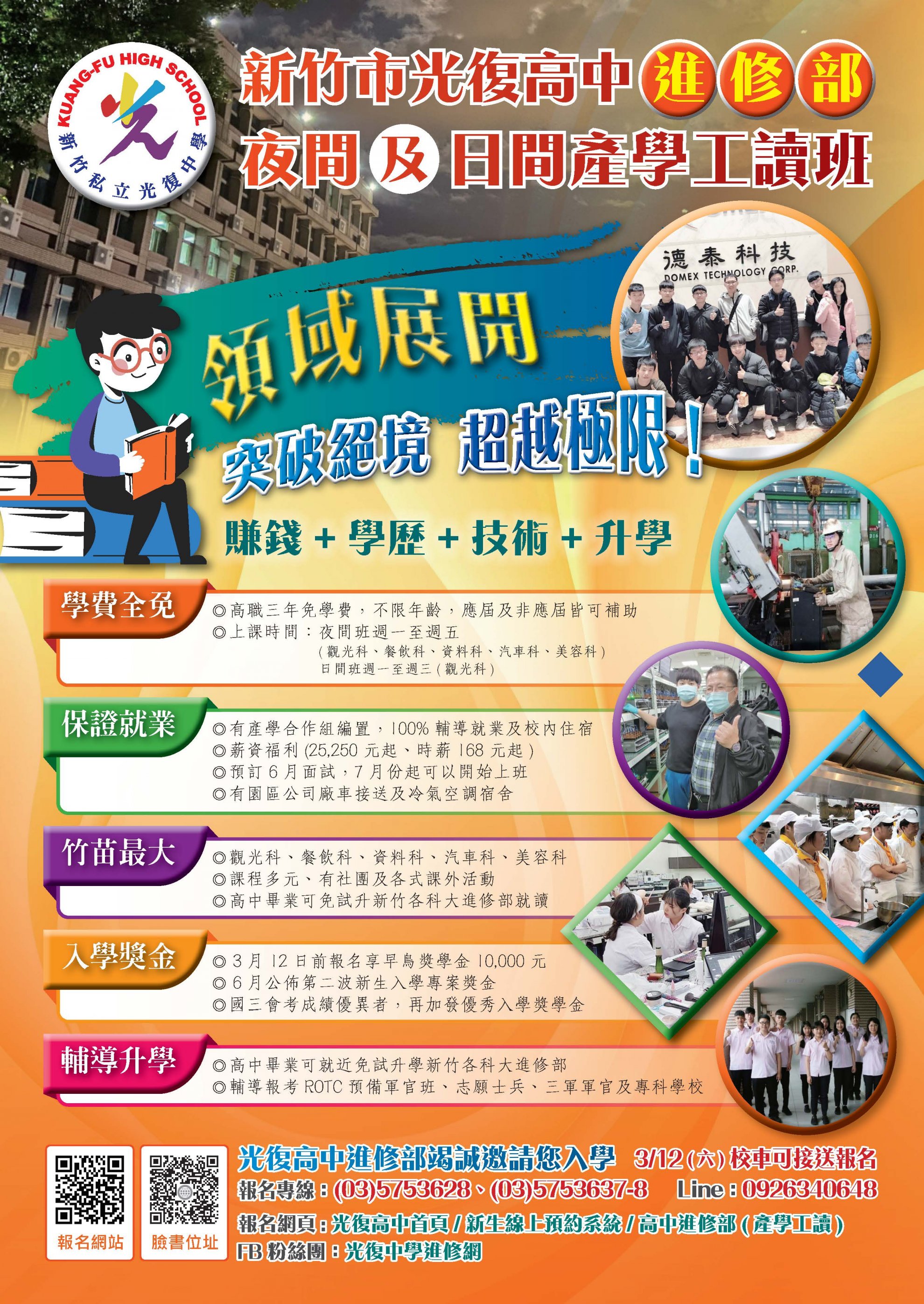 (一)請協助將資料轉知適性學生,由學生網路預約,由本校回電說明。電話: 03-5753628 及 03-5353637 ,報名預約請搜尋//光復高中首頁/新生線上預約系統/進修部(產學工讀)。 http://www.kfsh.hc.edu.tw/article/543 。