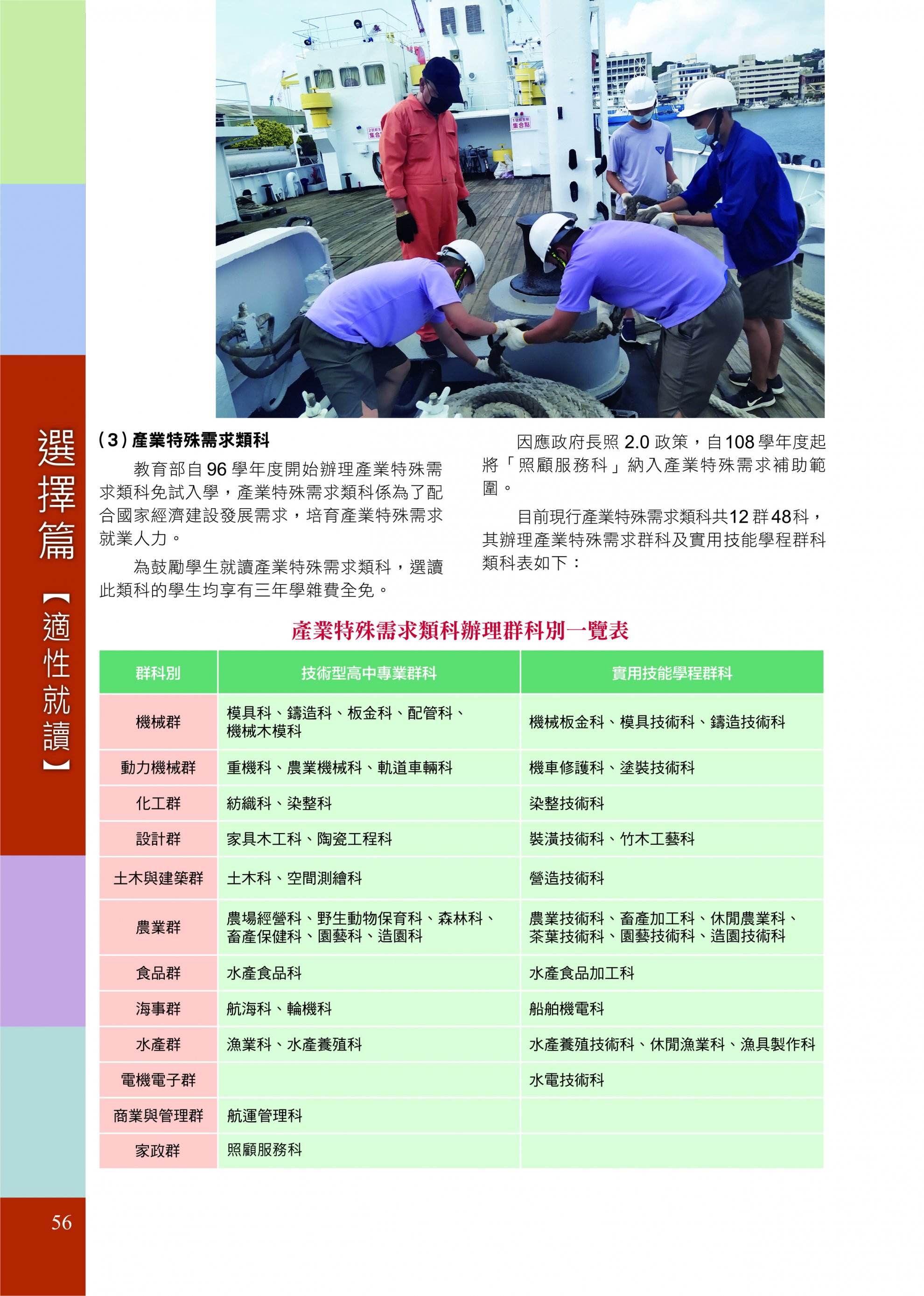 三、前開宣導手冊第 56頁,產業特殊需求類科辦理群科別一覽表,技術型高中專業群科之家政群「家政服務科」係誤植,更正為「照顧服務科」,如附件。