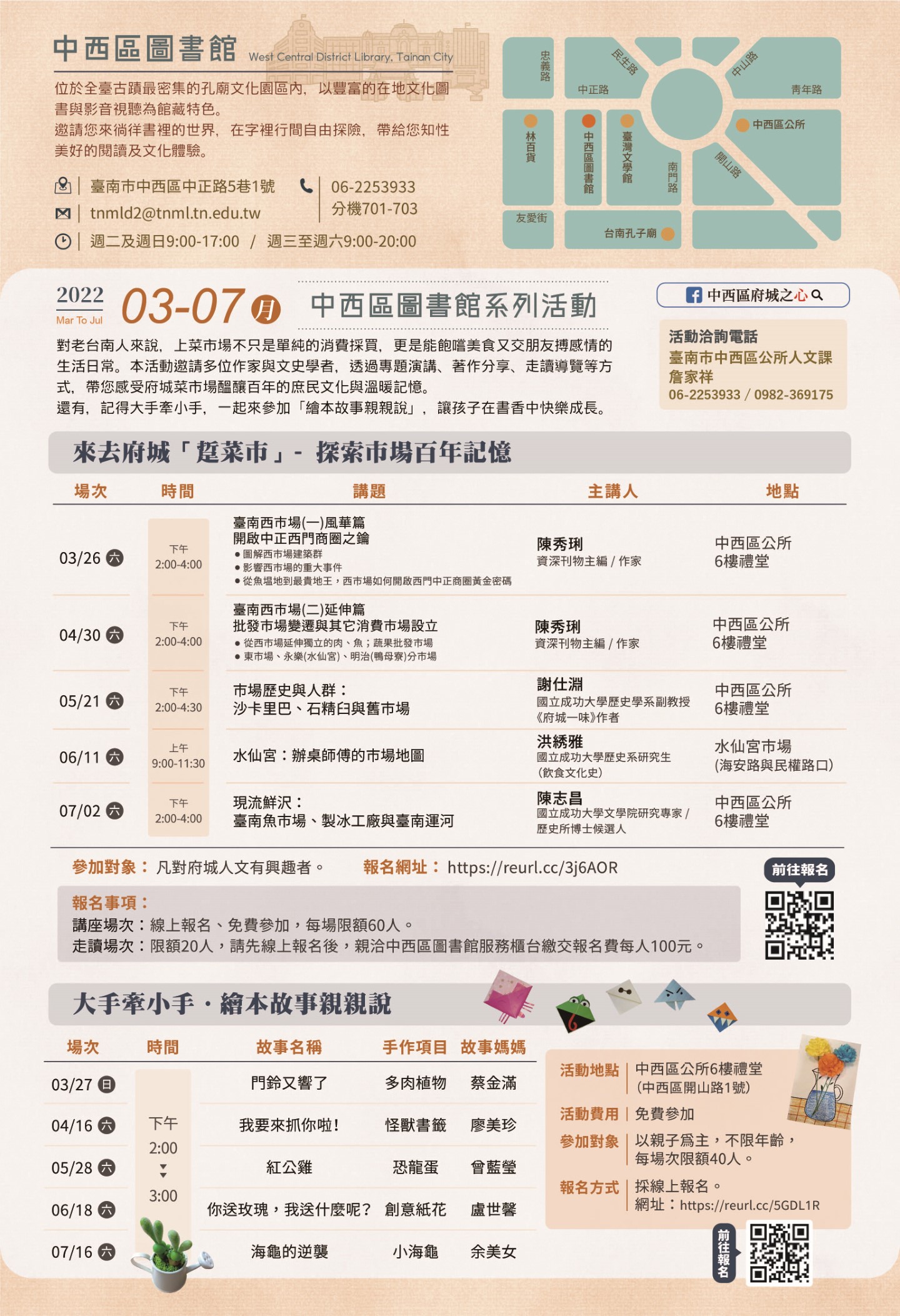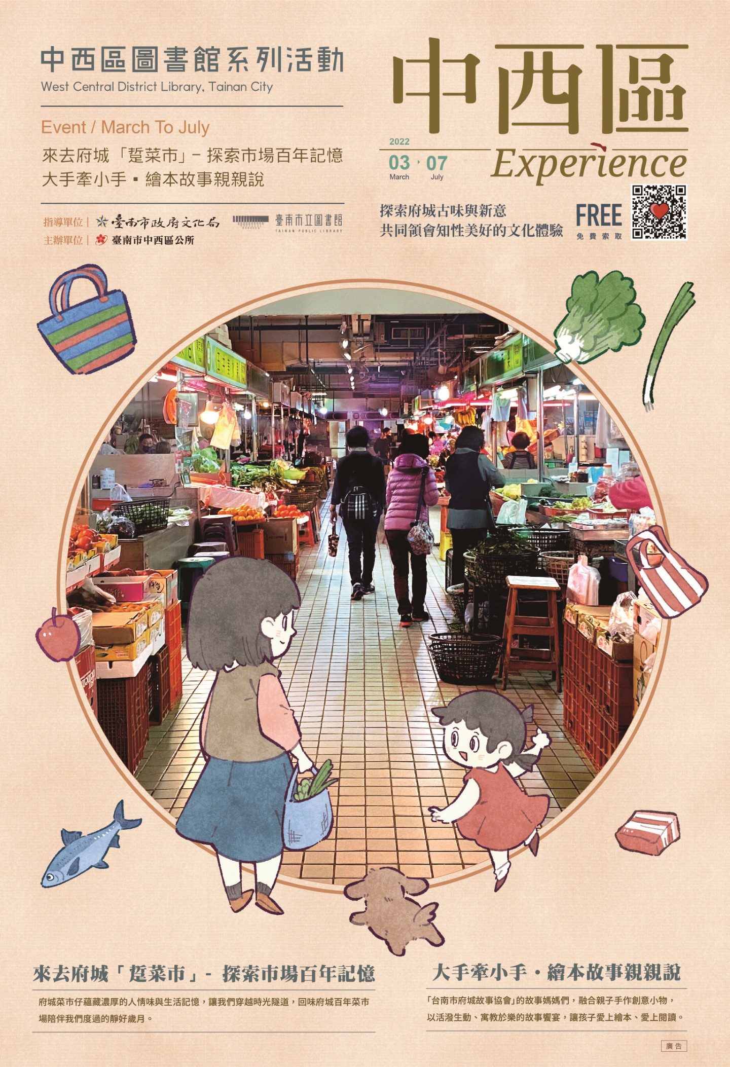 一、本系列活動以主題方式規劃 111 年 3 至 7 月期間,辦理「來去 府城『踅菜市』探索市場百年記憶」系列活動 5 場次及「大 手牽小手.繪本故事親親說」說故事暨親子手作活動 5 場 次。