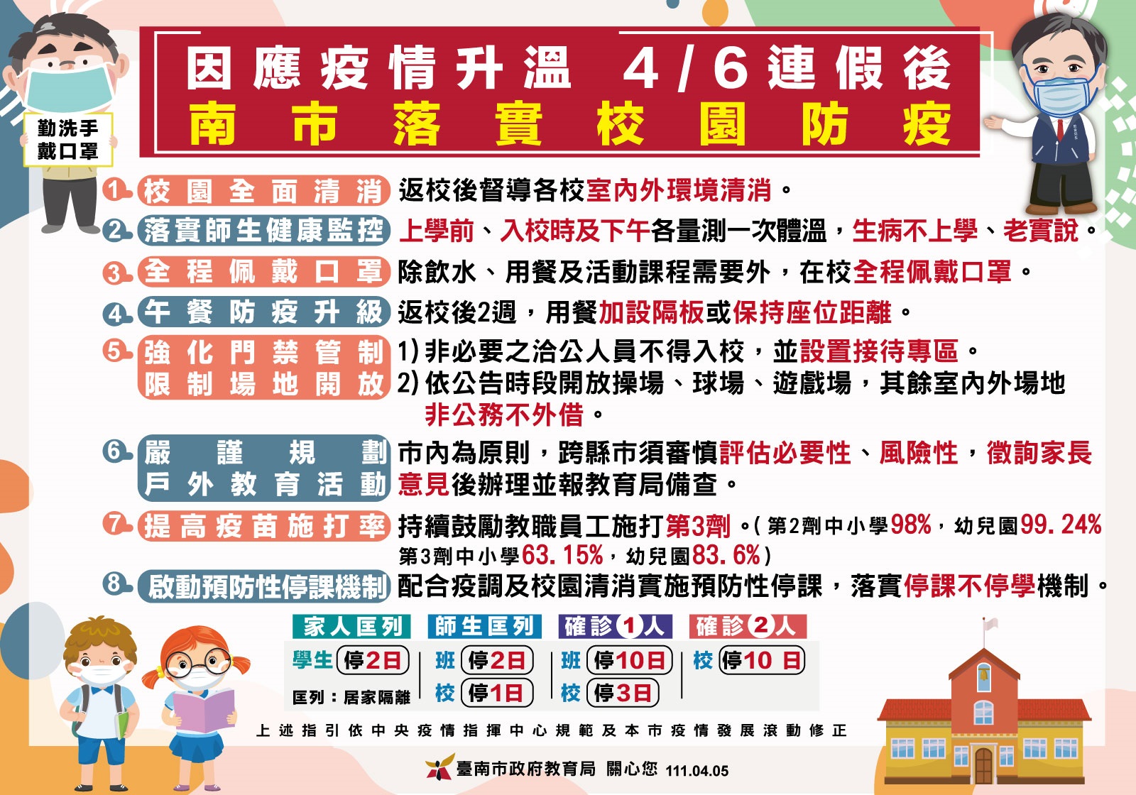一、近期國內新冠肺炎疫情升溫,為維護師生健康安全,請於 4 月 6 日連假後,務必落實校園各項防疫工作: