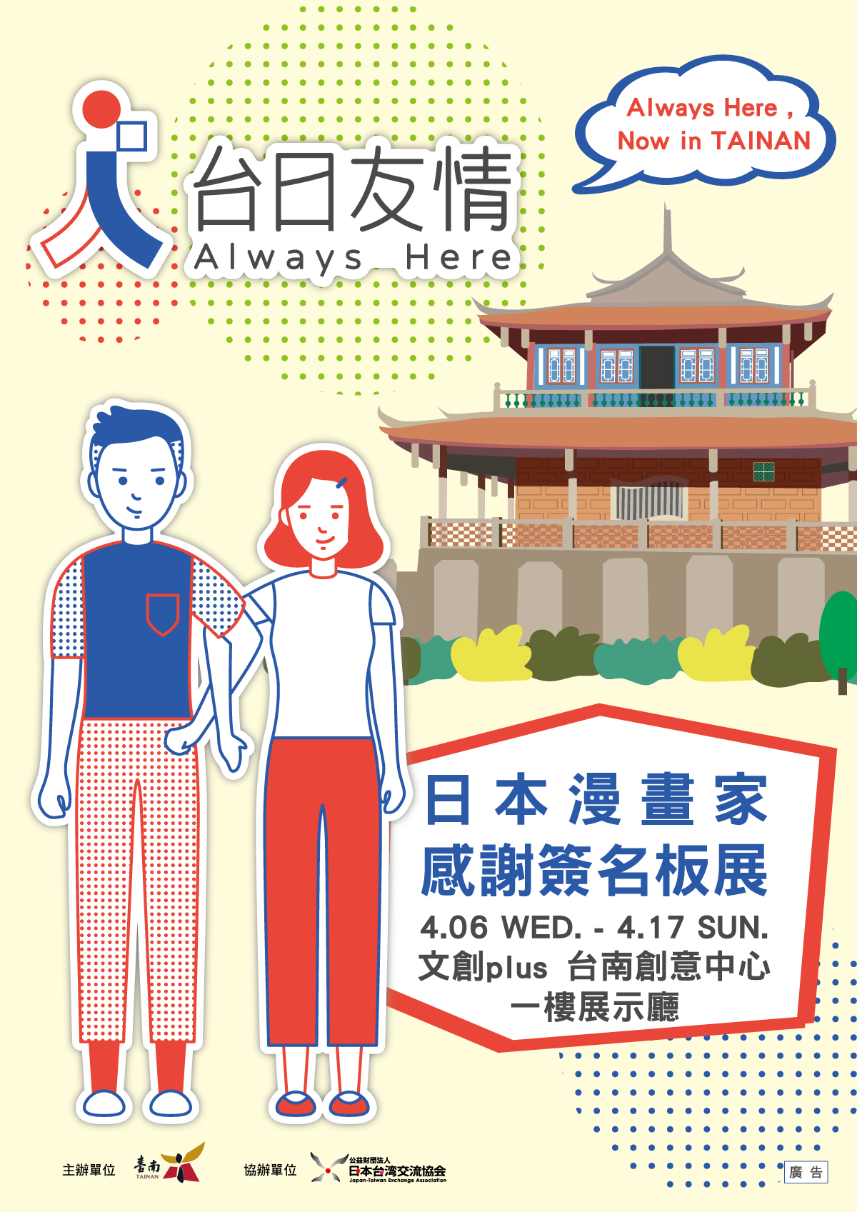 一、為感謝台灣民眾於日本 311 大地震時協助震災,上百位日本 人氣漫畫家親繪簽名圖版並留言感謝台灣民眾;該批簽名 圖板於本市文創 plus 台南創意中心(原愛國婦人館,地 址: 700 台南市中西區府前路一段 195 號)免費展出至 111 年 4 月 17 日止,展覽相關資訊如附件。