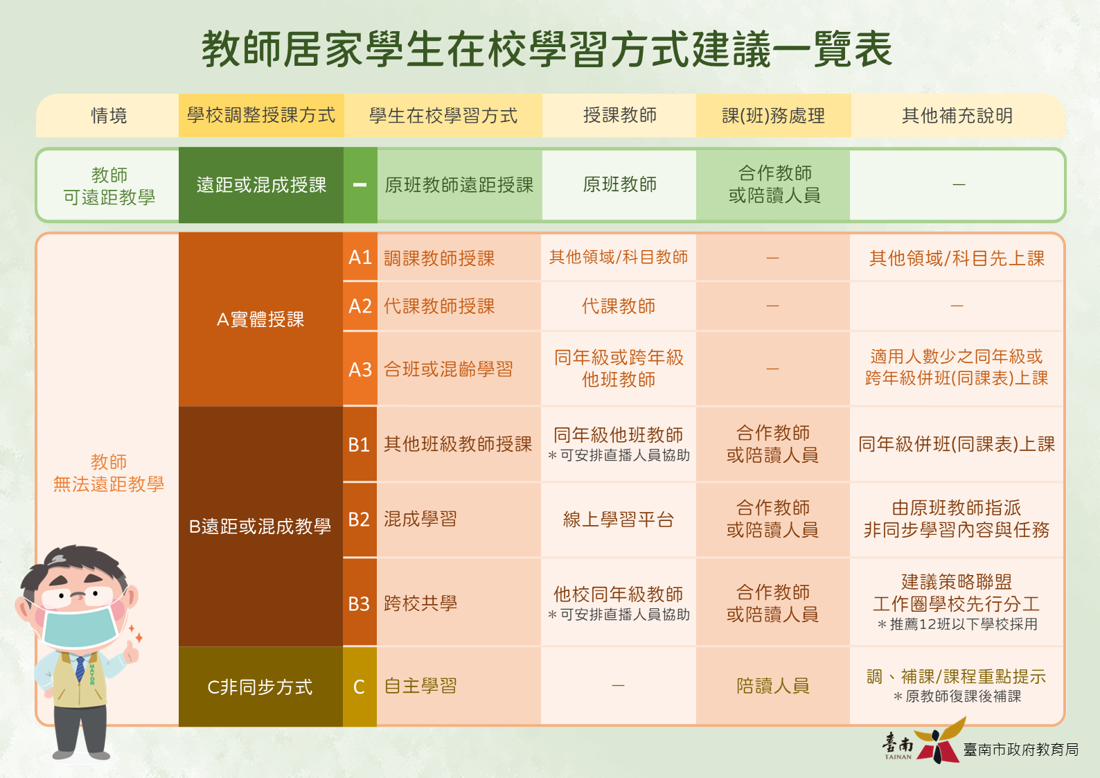 說明: 一、依據本局 111 年 4 月 29 日南市教課(二)字第 1110562409 號函續辦。 二、有關教師課務處理事宜,請各校依上開函文辦理。惟為維持各校教學運作與品質,特針對「教師居家任課班級學生在校」此種狀況所衍生之學習方式,製作「教師居家學生在校學習方式建議一覽表」(如附件 1 、 2)供各校參採。