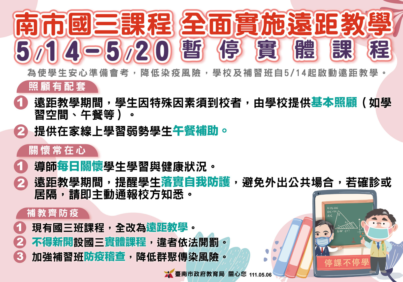 一、為降低國三學生因染疫而未能參加國中教育會考風險,俾利臺南考區 111 年國中教育會考試務工作順利進行,經臺南市政府 111 年 5 月 5 日一級指揮中心會議通過,自 111 年 5 月 14 日至 20 日全市各公私立國中三年級課程全部暫停實體授課,改採遠距教學。