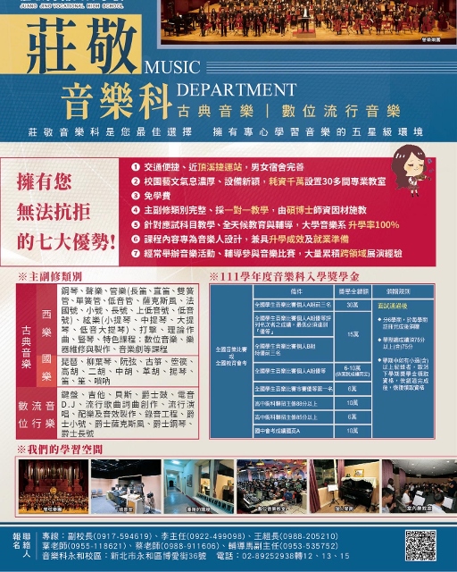 主旨:本校擬辦理「莊敬高職國際學校藝術群音樂科線上辦學說明會」,請貴校惠予公告訊息,協助有需求之親師生參加,請 查照。 說明: 一、說明會目的:協助國中教師、學生及家長瞭解本校課程規劃、生活管理與學習環境,引領學生適性生涯發展。 二、時間: 111 年 6 月 20 日(星期一)晚上 7:00 至 8:30 。 三、對象:國中教師、學生及其家長。 四、進行方式:本活動無須報名,請直接登入會議連結: https://meet.google.com/csc-aevt-jwj