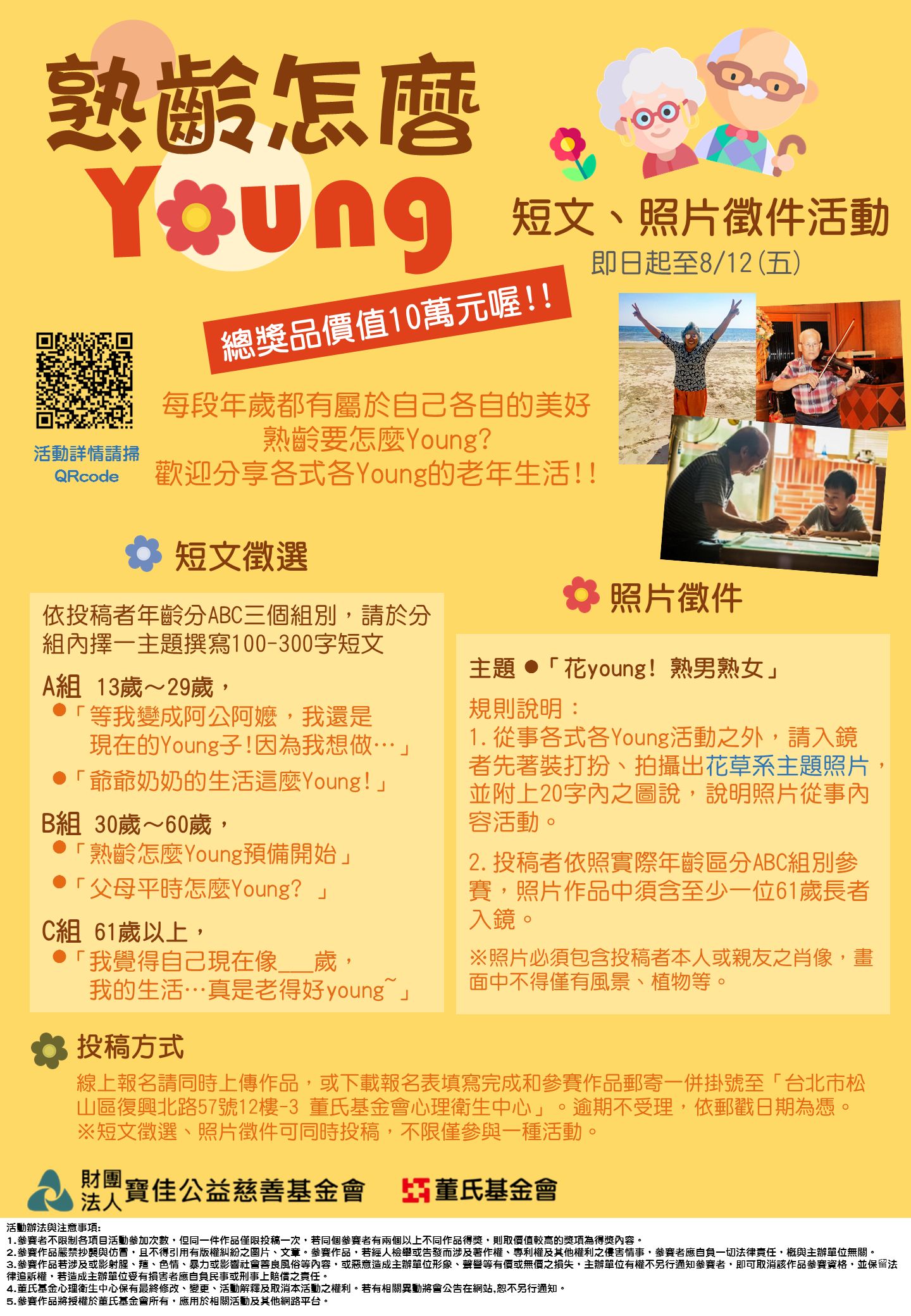 三、敬邀 貴校協助將「熟齡怎麼 young-短文、照片徵件活動」於學校官網、電子佈告欄及相關網路平台宣傳活動訊息,邀請師生及其親友踴躍參與。如蒙惠允、不勝感激。