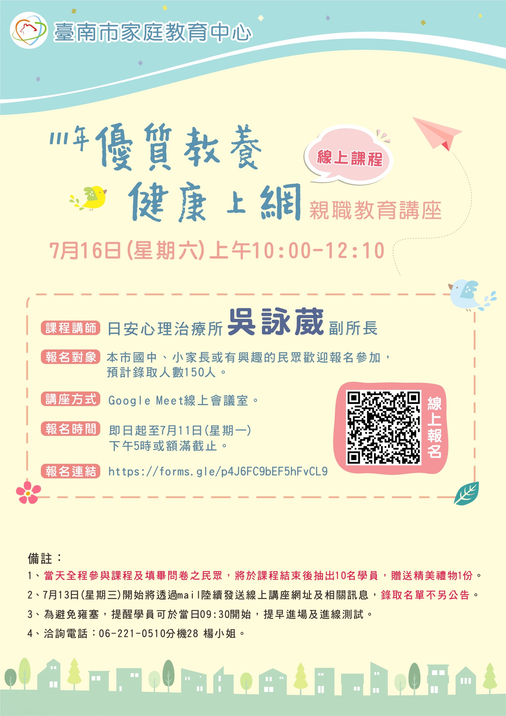 | 標題:本市家庭教育中心辦理 111 年「優質教養、健康上網」親職教育線上講座,請轉知家長及教師踴躍參與。 | |