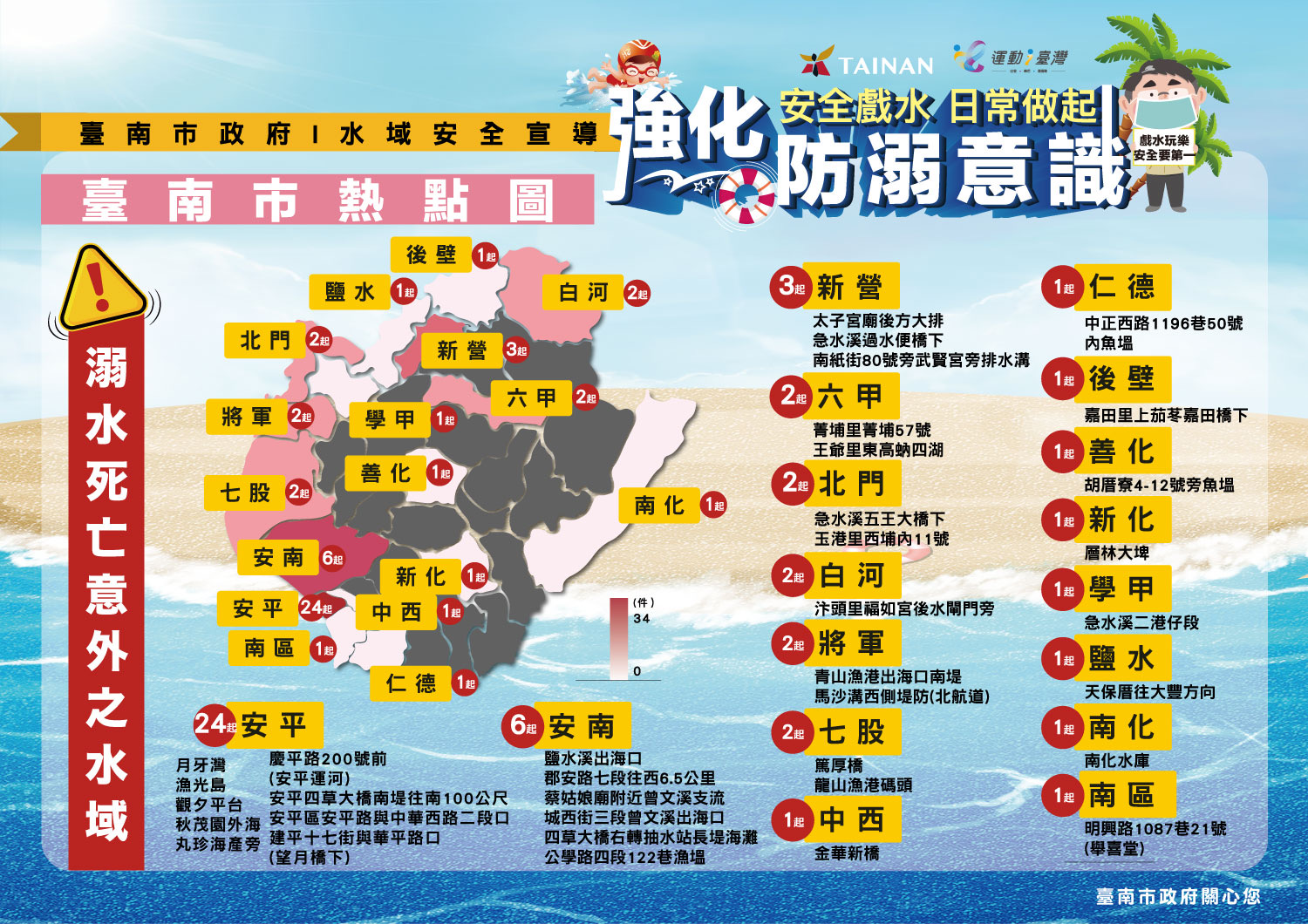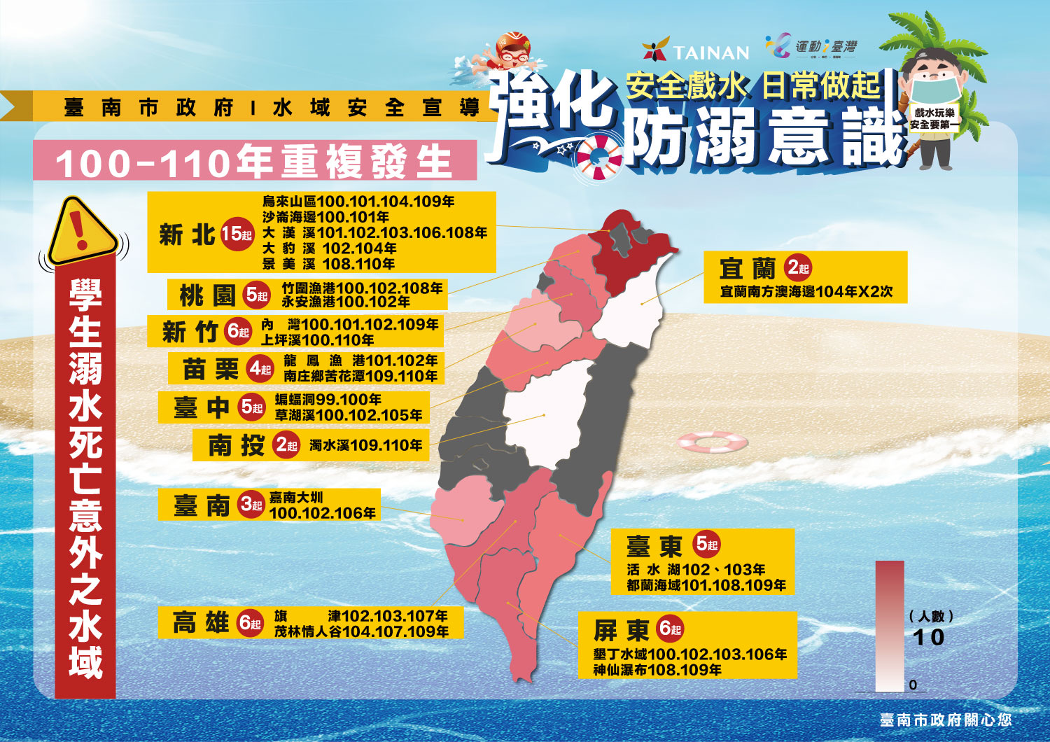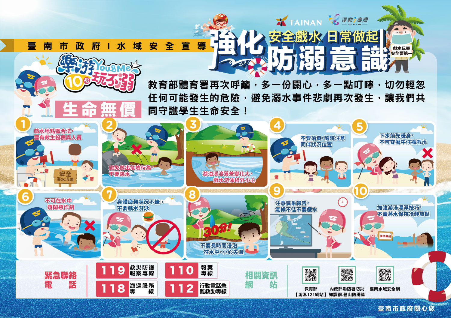 三、檢附「強化防溺意識-叫叫伸拋划」、「強化防溺意識-危險水域辨識」、「強化防溺意識-樂游玩不溺」、「強化防溺意識-學生溺水死亡意外之水域」、「強化防溺意識-溺水死亡意外水域」及「水域遊憩活動警示旗幟與水域安全標誌」供參。
