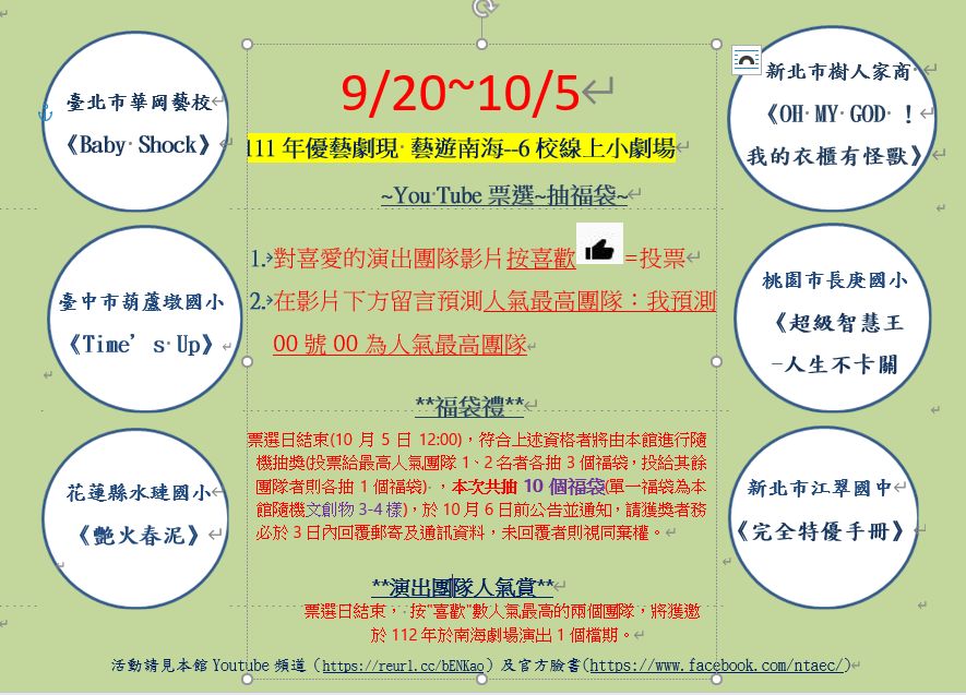 二、檢附原函、旨揭活動簡介、福袋簡介、 6 校團隊劇目介紹及海報各 1 份如附件。