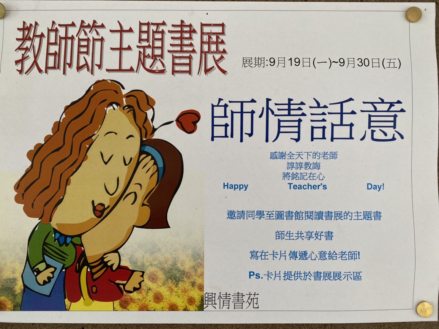 本校興情書苑 111 學年度教師節主題書展—師情話意, 9/19 (一)~9/30 (五),敬請同學踴躍參加