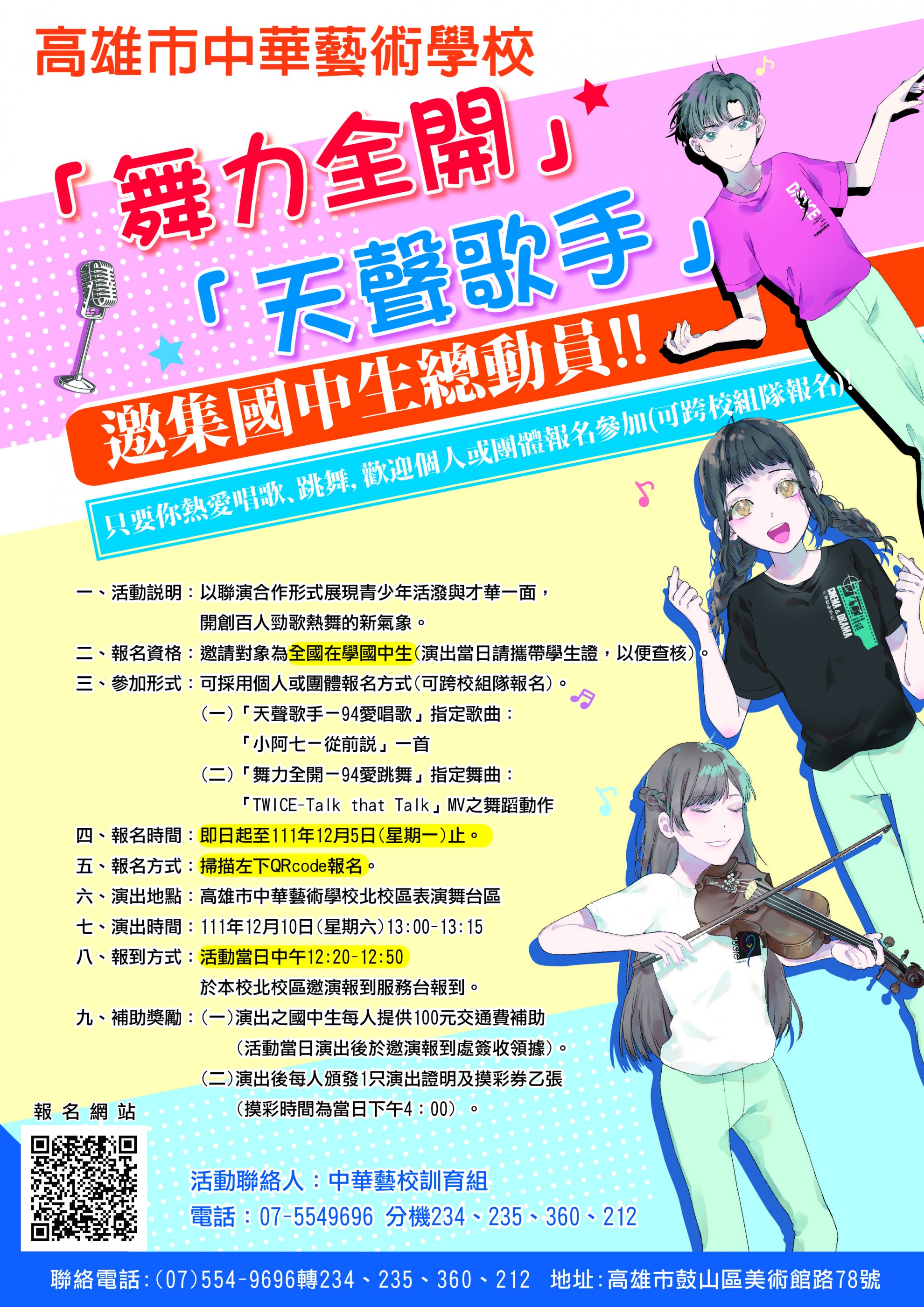三、檢附「舞力全開 94 愛跳舞」、「天聲歌手 94 愛唱歌」邀演 辦法及活動 DM 乙份,敬請惠予公告宣導鼓勵學生踴躍報 名。 四、本案聯絡人:中華藝校訓育組(電話: 07-5549696 分機 234 、 360 、 235 、 212)。