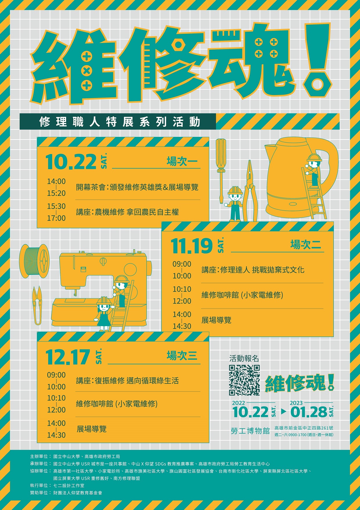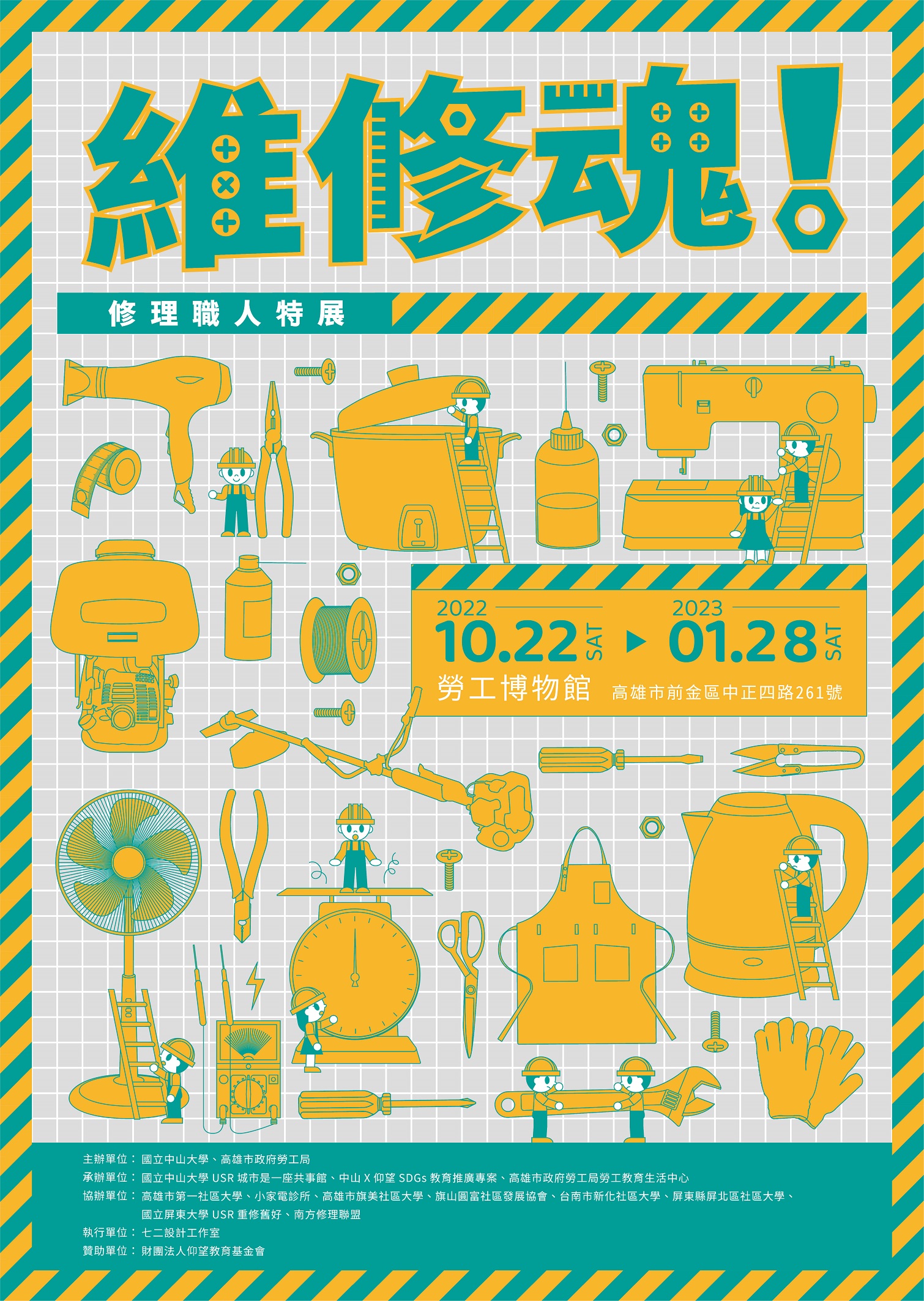 一、本展覽於民國 111 年 10 月 22 日至 112 年 1 月 28 日假高雄市勞工博物館(高雄市前金區中正四路 261 號)展出,以深入淺出的方式了解維修是循環經濟的一環,與其在當代環境、經濟、社會的多重價值。