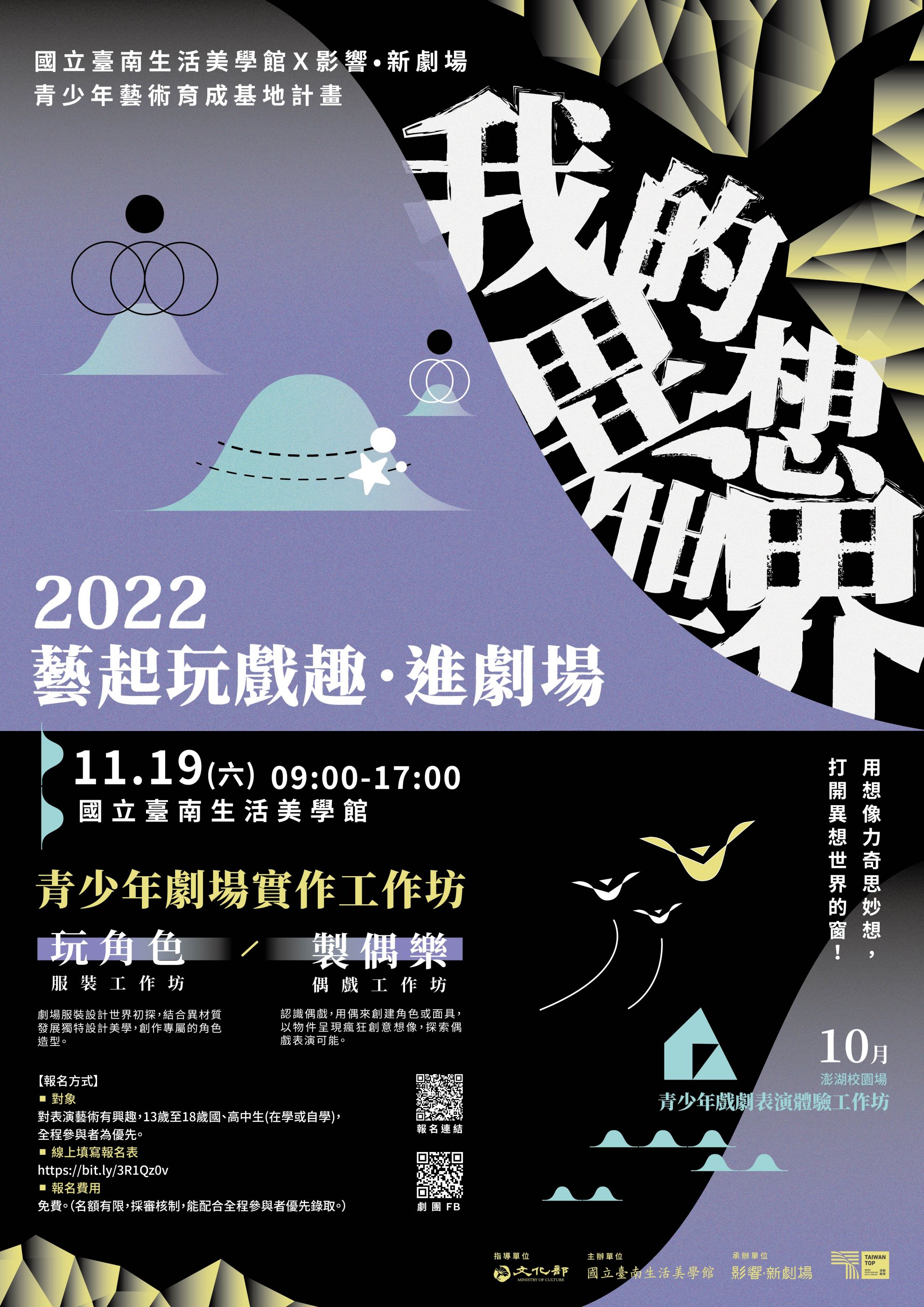 二、活動資訊: (一)辦理日期及時間: 11/19(六)09:00-17:00 (二)活動地點:國立臺南生活美學館(臺南市中西區中華西路 二段 34 號) 三、課程內容:(一)「玩角色-服裝工作坊」 (二)「製偶樂-偶戲工作坊」