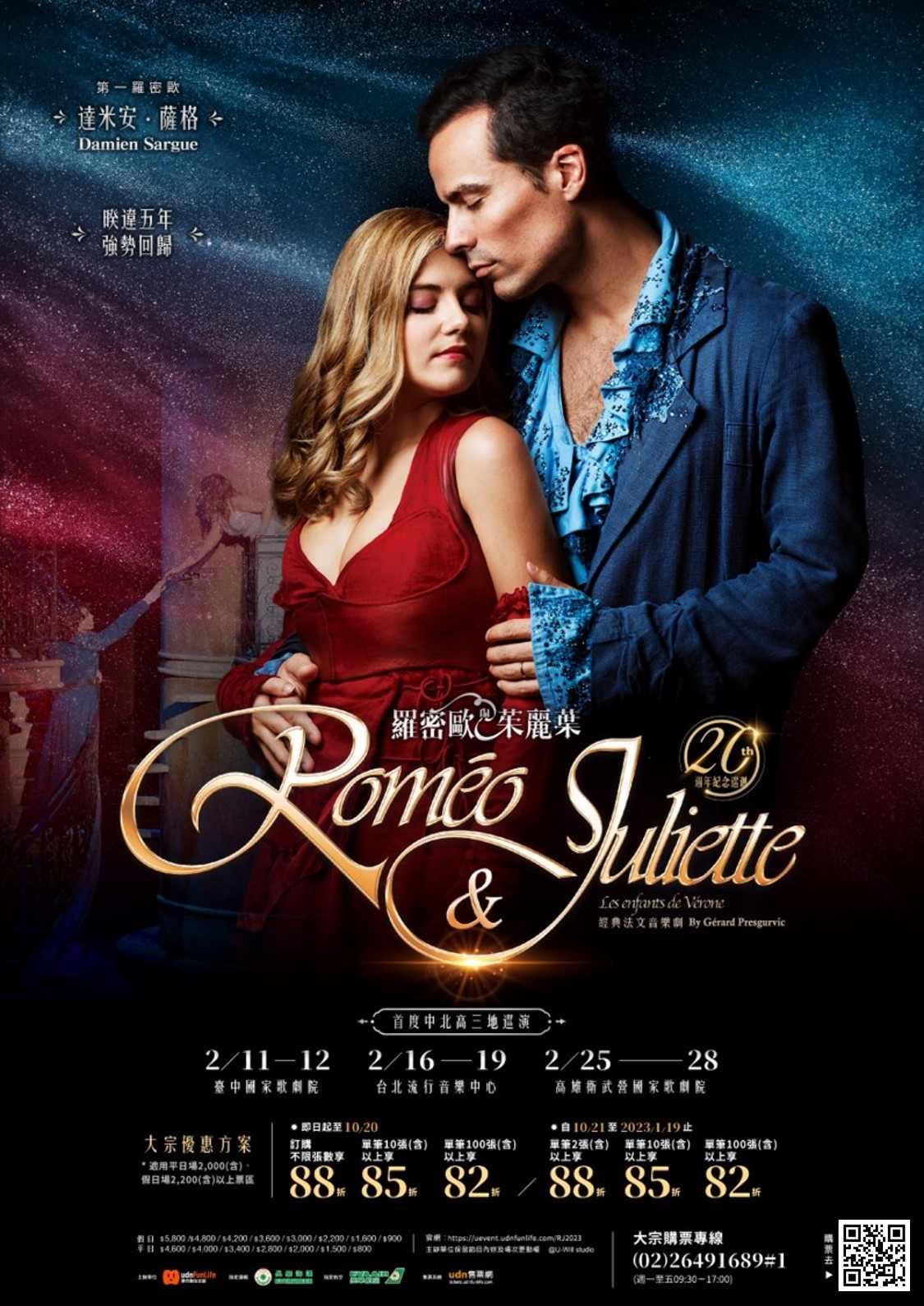 於 112 年 2 月 11 日(周六)起至 112 年 2 月 28 日(周 二)分別於臺中國家歌劇院、台北流行音樂中心、高雄衛 武營國家藝術中心舉辦經典法文音樂劇《羅密歐與茱麗 葉》