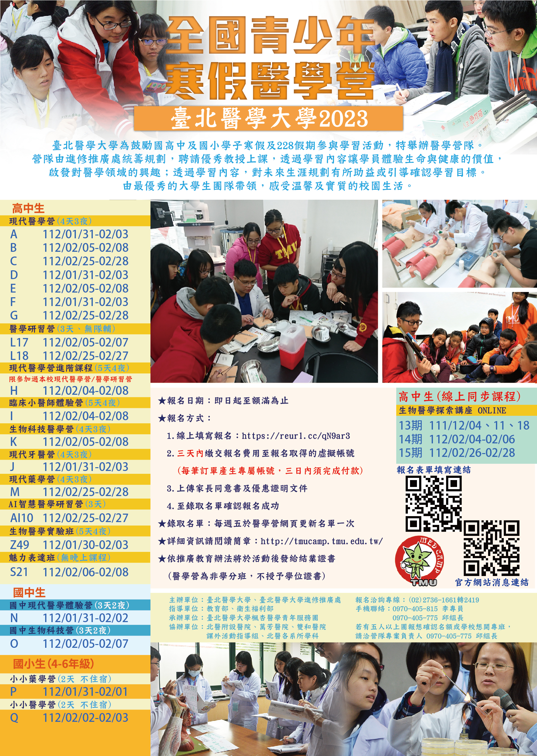 (一)2023 寒假醫學營擬訂於民國 112 年 1 月 30 日至 2 月 8 日辦 理。